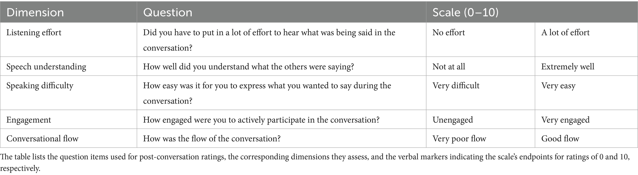 After the initial comparison task, participants entered the communication phase, during which they discussed the item order. A paper sheet displaying all items from the set was placed in front of each participant on a holder. The experimenter initiated this phase by clapping (to assist with audio alignment), followed by the playback of background noise. Participants had up to 10 min to discuss the items and signaled to the experimenter when their discussion was complete. Following the communication phase, participants answered five questions via the Unity app, rating aspects such as listening effort, engagement, perceived conversation fluency, speaking difficulty, and speech understanding on a scale from 0 to 10 (see Table 1). They then performed the item-comparison task again. Communication was only allowed during the discussion phase, not during individual judgements. The presentation of item pairs and the order of questions were randomized. Each topic was presented in two acoustic conditions (one in noise and one in quiet), with the order of topics and noise conditions randomized.