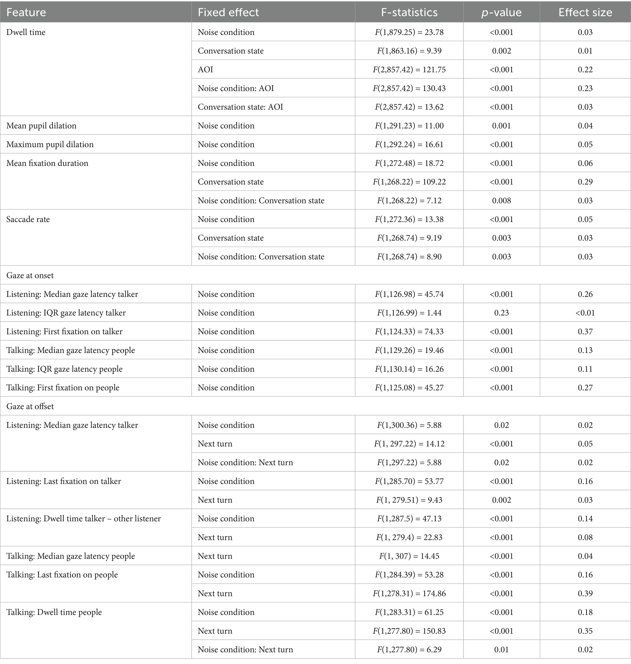 In quiet conditions, participants spent significantly more time looking at the task material compared to their interlocutors [28.9%, t(852) = 19.04, p < 0.0001] or their faces [31.9%, t(852) = 20.98, p < 0.0001]. A small but significant main effect of conversation state and a large interaction effect between conversation state and AOIs were observed (Table 2). Post-hoc tests revealed that the effect of conversation state was primarily driven by differences in the face and people AOIs. Specifically, participants exhibited a 5.7% increase in dwell time on faces during listening compared to talking [t(854) = 3.62, p = 0.0003] and a 6.5% increase in dwell time on the people AOI [t(854) = 4.10, p < 0.0001]. No significant difference in dwell time on the task material was observed between listening and talking [t(854) = −2.42, p = 0.02]. In noisy conditions, gaze behavior shifted notably. Dwell time on the task material decreased by 16.4% [t(860) = 10.33, p < 0.0001], while gaze time on interlocutors increased by 15.6% [t(860) = −9.86, <0.0001]. As a result, there was no longer a significant difference in gaze time between the task material and interlocutors in noisy environments [t(852) = −1.87, p = 0.06].