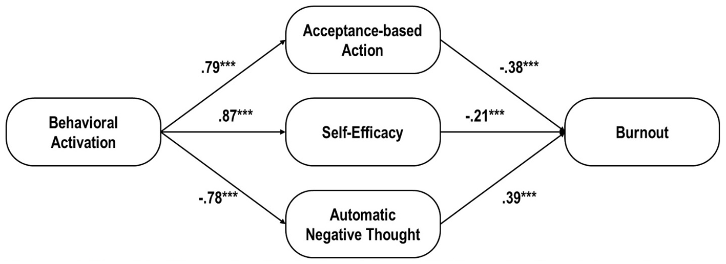 Path analysis results indicated that higher behavioral activation levels were associated with increased acceptance-based action and self-efficacy, as well as reduced automatic negative thoughts. Additionally, greater acceptance-based action and self-efficacy were linked to lower burnout levels, whereas more frequent automatic negative thoughts were associated with higher burnout levels. Furthermore, structural equation modeling revealed that the relationship between behavioral activation and psychological burnout was fully mediated by these three variables.