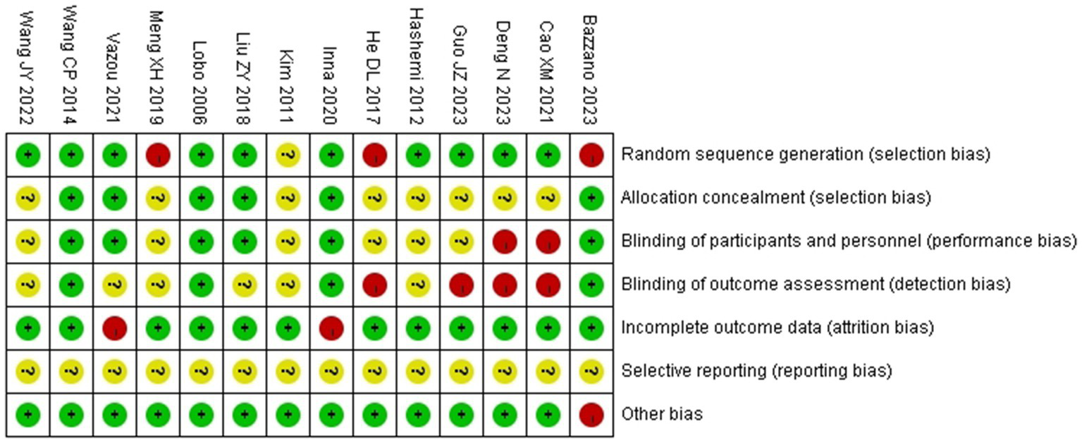 We performed a Cochrane risk of bias assessment for each study. The full results are shown in Figures 2, 3. Overall, the included studies had good methodological quality, with four studies rated with strong quality, seven studies with moderate quality, and three studies with low quality.