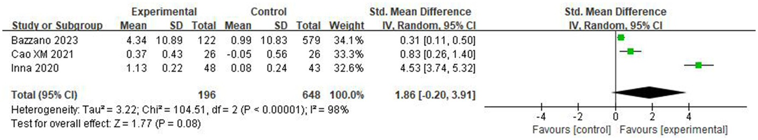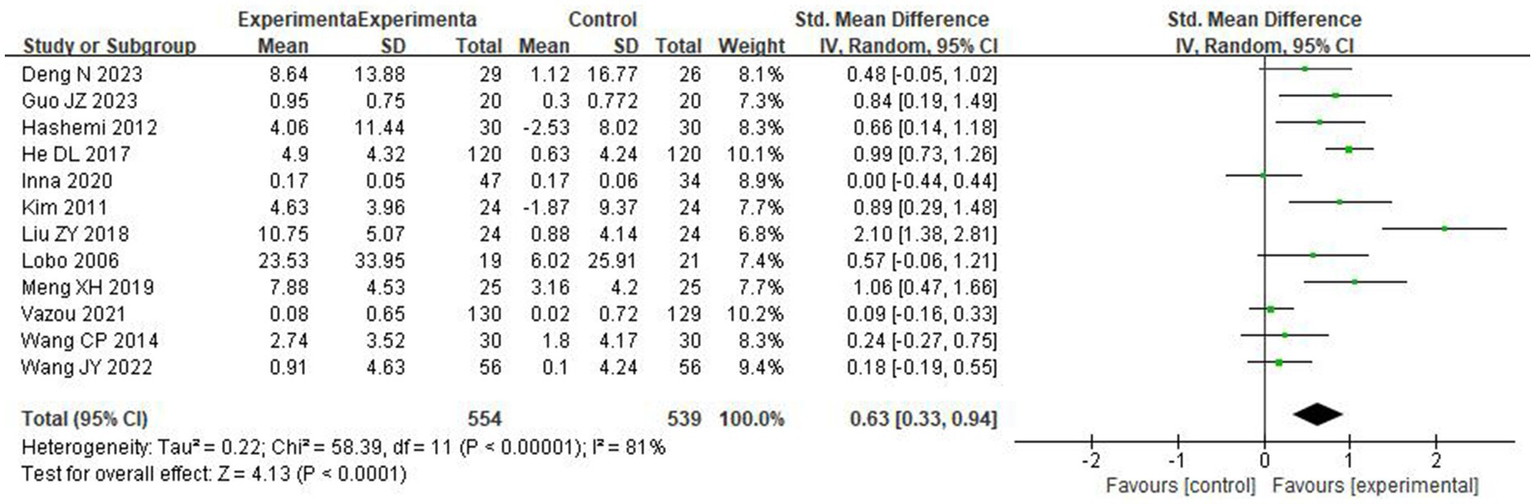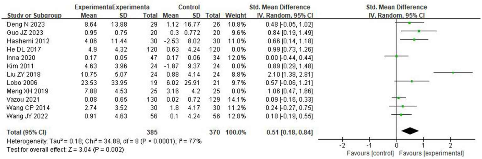 Meta-analysis was performed using Review Manager 5.4, and a leave-one-out analysis was performed to assess the sensitivity using Stata 15.1. The summary statistics for each outcome were the mean change from baseline and standard deviations (SD) of the mean change. The mean change in each group was obtained by subtracting the final mean from the baseline mean. The SD of mean change was computed in line with Follmann et al. (1992), which assumed a conservative correlation coefficient of 0.5. The standardized mean difference (SMD) and 95% confidence interval (CI) were calculated for the summary effect of continuous data. Results were considered significant when the CI did not include zero.