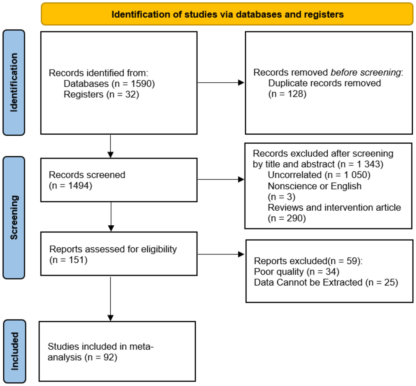 Selection Criteria: (1) Literature in both Chinese and English; (2) Type of literature: Quantitative empirical studies; (3) Research objective: To explore the relationship between exercise intention and behavior; (4) Research findings must clearly present sample size and effect size indicators. The literature selection was carried out collaboratively by two researchers, with disputed cases being resolved by a third researcher. A total of 92 articles were included, and the screening process is illustrated in Figure 1.
