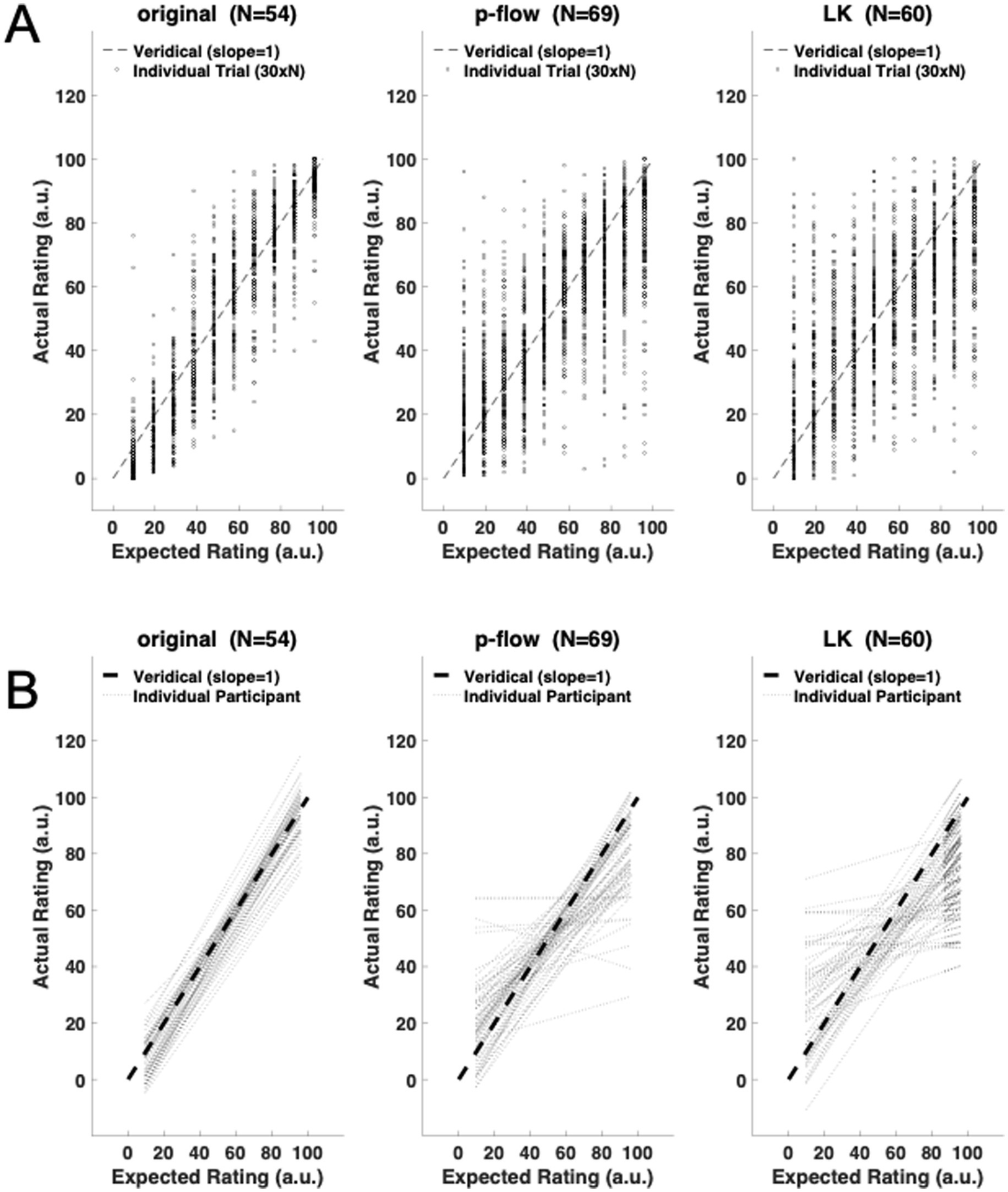 Figure 2. (A) Trial-wise scatter plot of the expected and actual ratings for each algorithm: the original movies, p-flow movies, and the optical flow movies made with the Lucas–Kanade (LK) method. Only data between the 21th and the 50th trials are shown (see Figure 1). The broken line represents the veridical response in which the expected and actual ratings are the same. (B) Participant-wise regression of the actual ratings for each of the movies. The slopes and the intercepts are mostly veridical, i.e., close to 1.0 and 0.0, respectively, but are less accurate in the p-flow than the original, and in the LK method than the p-flow for some participants. The broken line represents the veridical response in which the expected and actual ratings are the same.