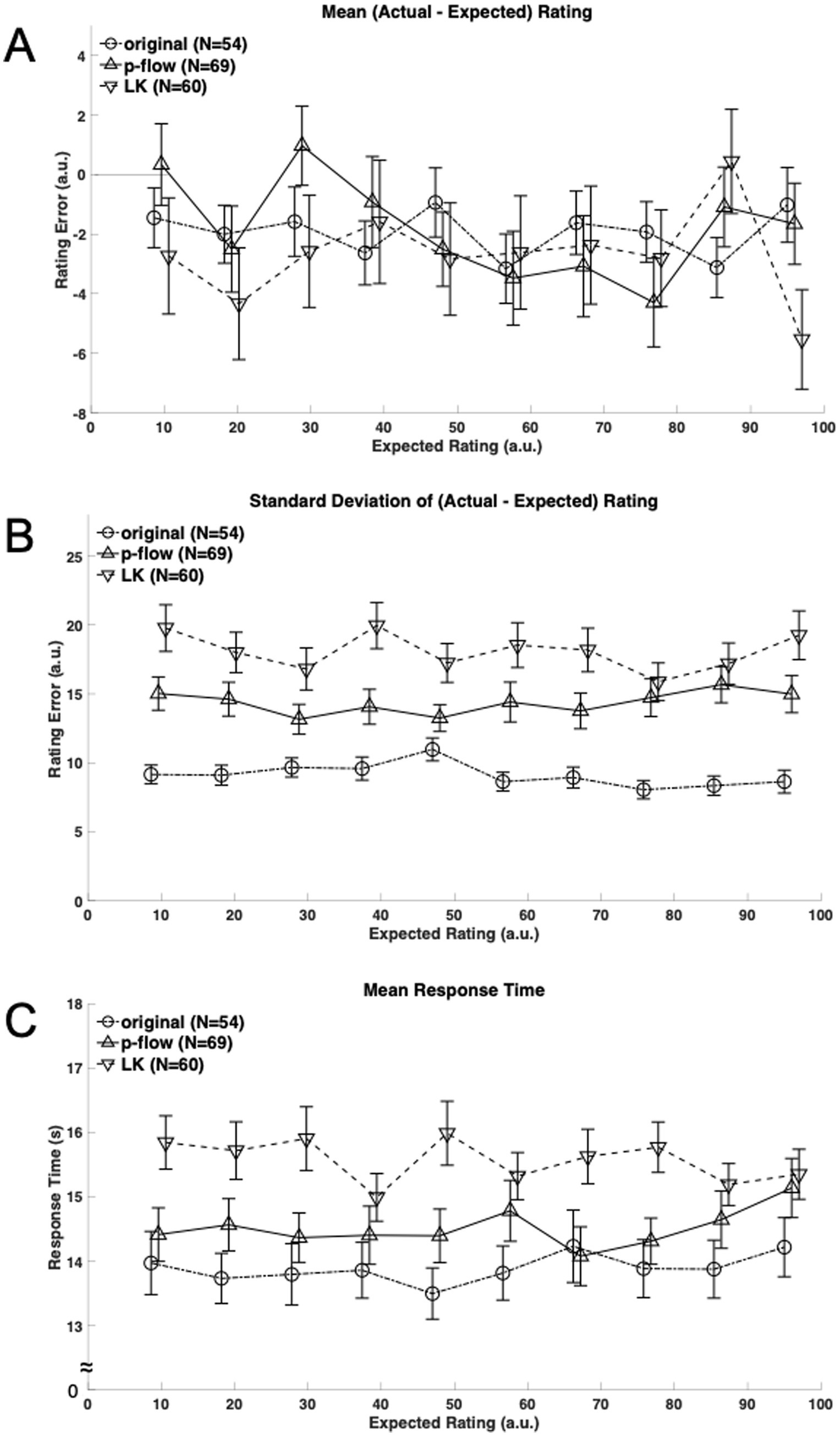Figure 3. (A) Mean rating error defined as the difference between the actual and expected ratings is plotted against the expected viscosity rating ranks for each algorithm: the original, p-flow and LK movies with circles connected by broken lines, triangles by solid lines, and inverted triangles by broken lines, respectively. Note that there are shifts along the horizontal axis that were introduced between the algorithms merely for presentation purposes. (B) The standard deviation of the rating error across repeated presentations is plotted against the expected viscosity rating ranks for each algorithm: the original, p-flow and LK movies with circles connected by broken lines, triangles by solid lines, and inverted triangles by broken lines, respectively. (C) The mean response time across repeated presentations is plotted against the expected viscosity rating ranks for each algorithm: the original, p-flow and LK movies with circles connected by broken lines, triangles by solid lines, and inverted triangles by broken lines, respectively.