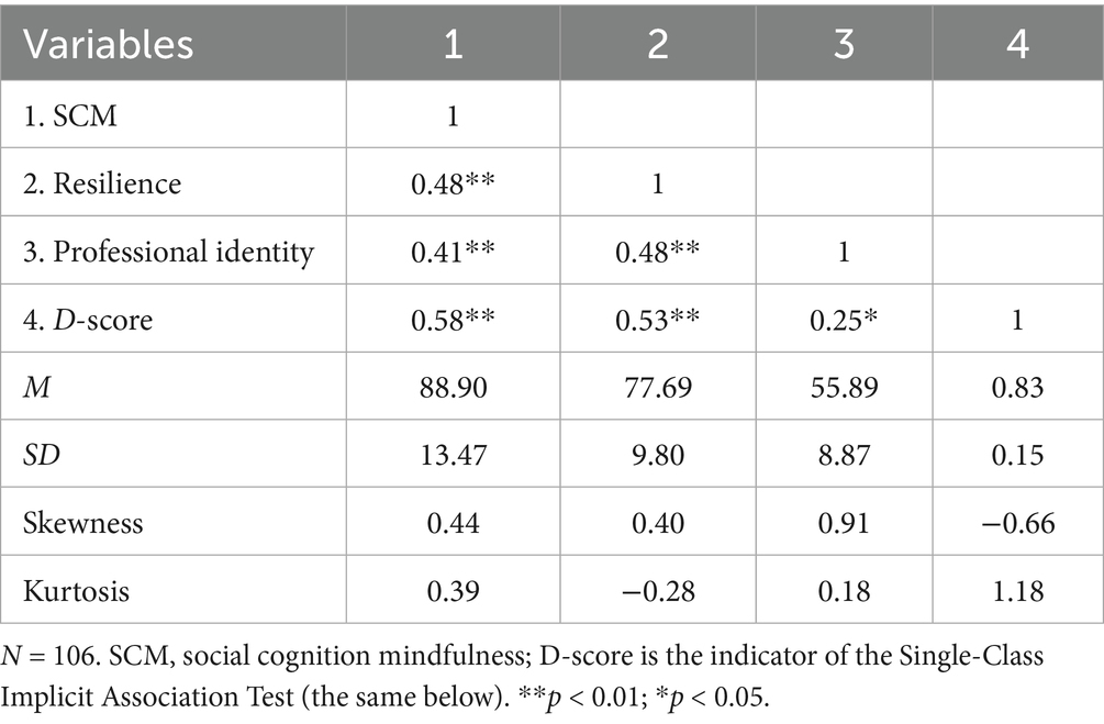 The data were analyzed using SPSS 26.0 and Amos 23.0. Specifically, (1) we used Amos 23.0 to perform the confirmatory factor analysis and test the construct validities of main variables; (2) SPSS 26.0 was utilized to examine Harman’s single-factor test; (3) descriptive statistics and correlations were performed; (4) Amos 23.0 was used to control covariates and explore the relationship mechanism among SCM, resilience, explicit and implicit professional identity.