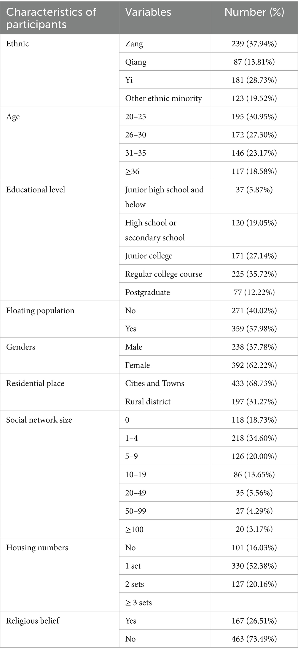 The sociodemographic characteristics of the sample are presented in Table 1. Of the 630 participants, 239 (37.94%) were Zang, 87 (13.81%) Qiang, 181 (28.73%) Yi, and 123 (19.52%) belonged to other ethnic minorities. Participants aged 20–25 accounted for 195 (30.95%), those aged 26–30 for 172 (27.30%), aged 31–35 for 146 (23.17%), and 117 (18.58%) were 36 or older. There were 238 males (37.78%) and 392 females (62.22%). Educational attainment was distributed as follows: 37 participants (5.87%) had completed junior high school or below, 120 (19.05%) high school or secondary school, 171 (27.14%) junior college, 225 (35.72%) a regular college (bachelor’s) course, and 77 (12.22%) postgraduate studies. With respect to migration status, 271 individuals (40.02%) were non-floating residents, whereas 359 (57.98%) were classified as floating population. Residential location showed that 433 participants (68.73%) lived in cities or towns, and 197 (31.27%) in rural districts. The required sample size was determined a priori using G*Power 3.1.9.7. Assuming a medium effect size f2 = 0.10, significance level α = 0.05, statistical power 1 – β = 0.90, and nine predictors, the software indicated a minimum sample of 149 cases. The actual sample of 630 participants therefore exceeds this requirement.