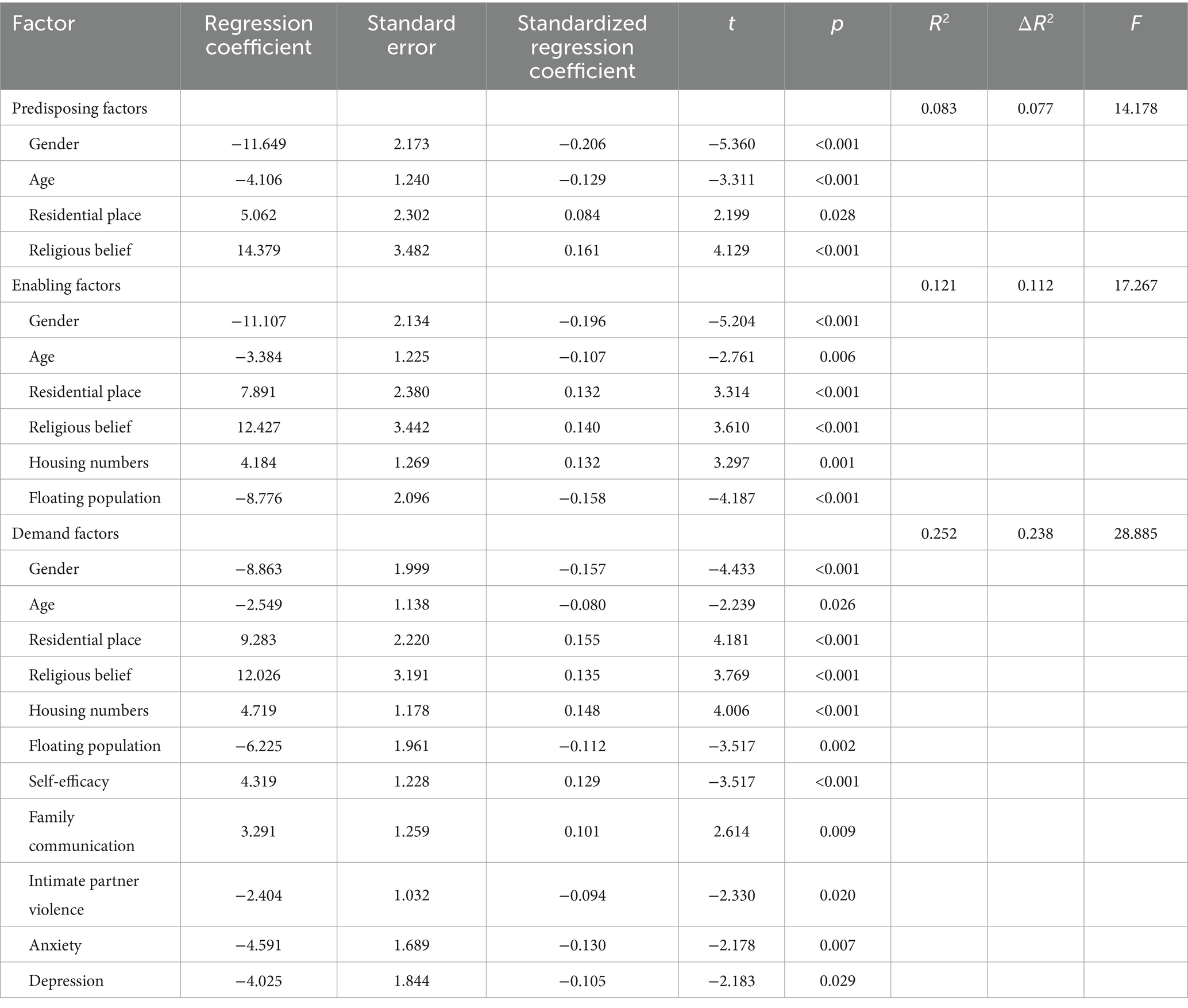 SPSS 24.0 was used for statistical description and inference of the data. Harman’s single-factor test was used to assess common method bias using χ2 and t-tests. The measurement items of five variables—self-efficacy, family communication, intimate partner violence, anxiety, and depression—were subjected to factor analysis, and five factors with eigenvalues greater than 1 were extracted. The results showed that the largest factor variance contribution was 37.77%, which was lower than the critical value of 40%, ruling out the problem of common method bias. Based on Andersen’s behavioral model as the theoretical framework, a stepwise multiple linear regression model was used for multifactor analysis, with predisposing factors as control variables, to construct the baseline Model I. On the basis of Model I, enabling factors were included to construct Model II, and on the basis of Model II, demand factors were included to construct Model III, with the significance level α = 0.05. The models are as follows: