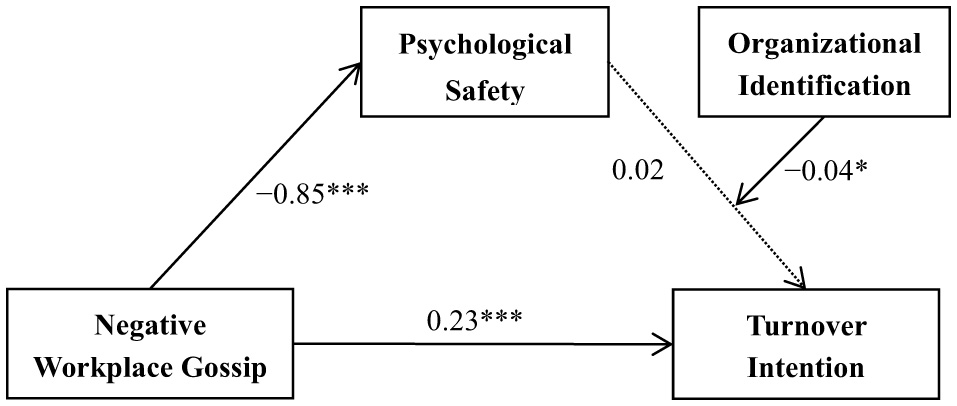 The study found that there was an association between negative workplace gossip and the turnover intention of kindergarten teachers. Psychological safety played a mediating role in this relationship, that is, negative workplace gossip influenced teachers' turnover intention by reducing their psychological safety. Meanwhile, organizational identification moderated the relationship between psychological safety and turnover intention. A higher level of organizational identification could weaken the negative impact of psychological safety on turnover intention.