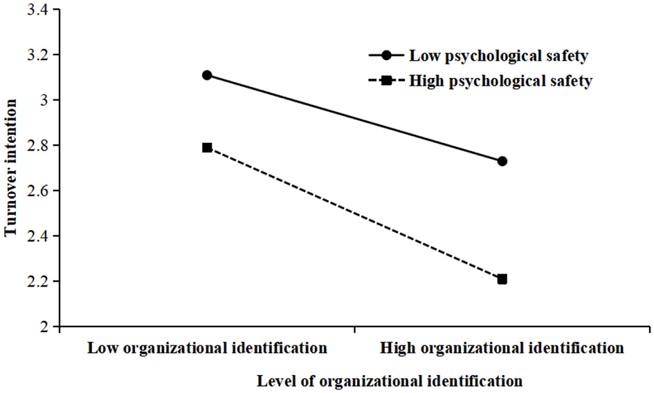 Hypothesis 3: Organizational identification moderates the association between psychological safety and kindergarten teachers' turnover intention. Psychological safety has a stronger association with turnover intention among kindergarten teachers with a high level of organizational identification than among those with a low level of organizational identification.