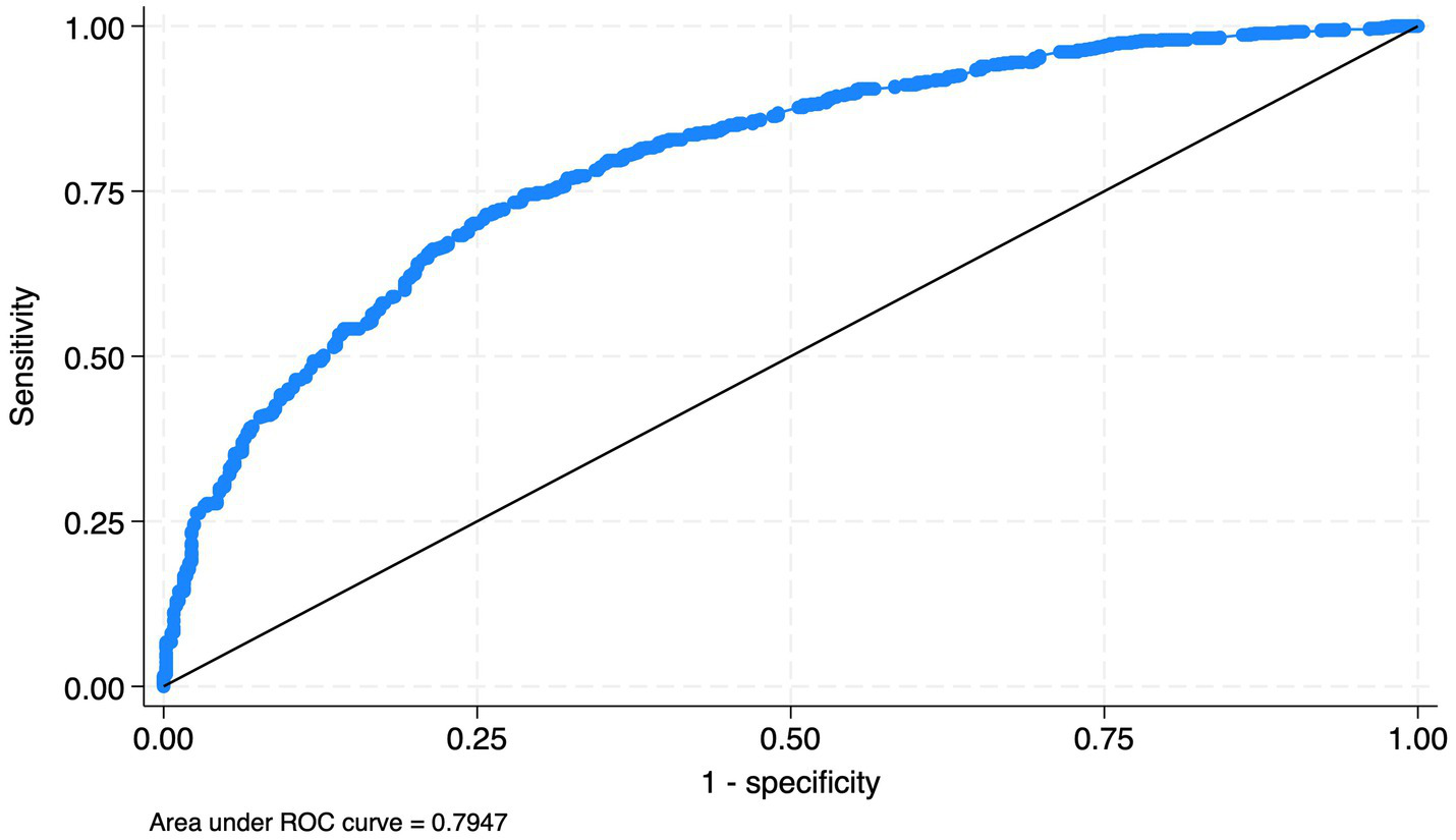 Figure 1. The Receiver Operating Characteristic (ROC) curve of the model. The blue curved line (ROC) represents the performance of our model at all classification thresholds, while the diagonal line represents the performance of a model that classifies outcomes no better than chance. The area under the blue line (AUC = 0.795) indicates that our model has good discriminative ability.