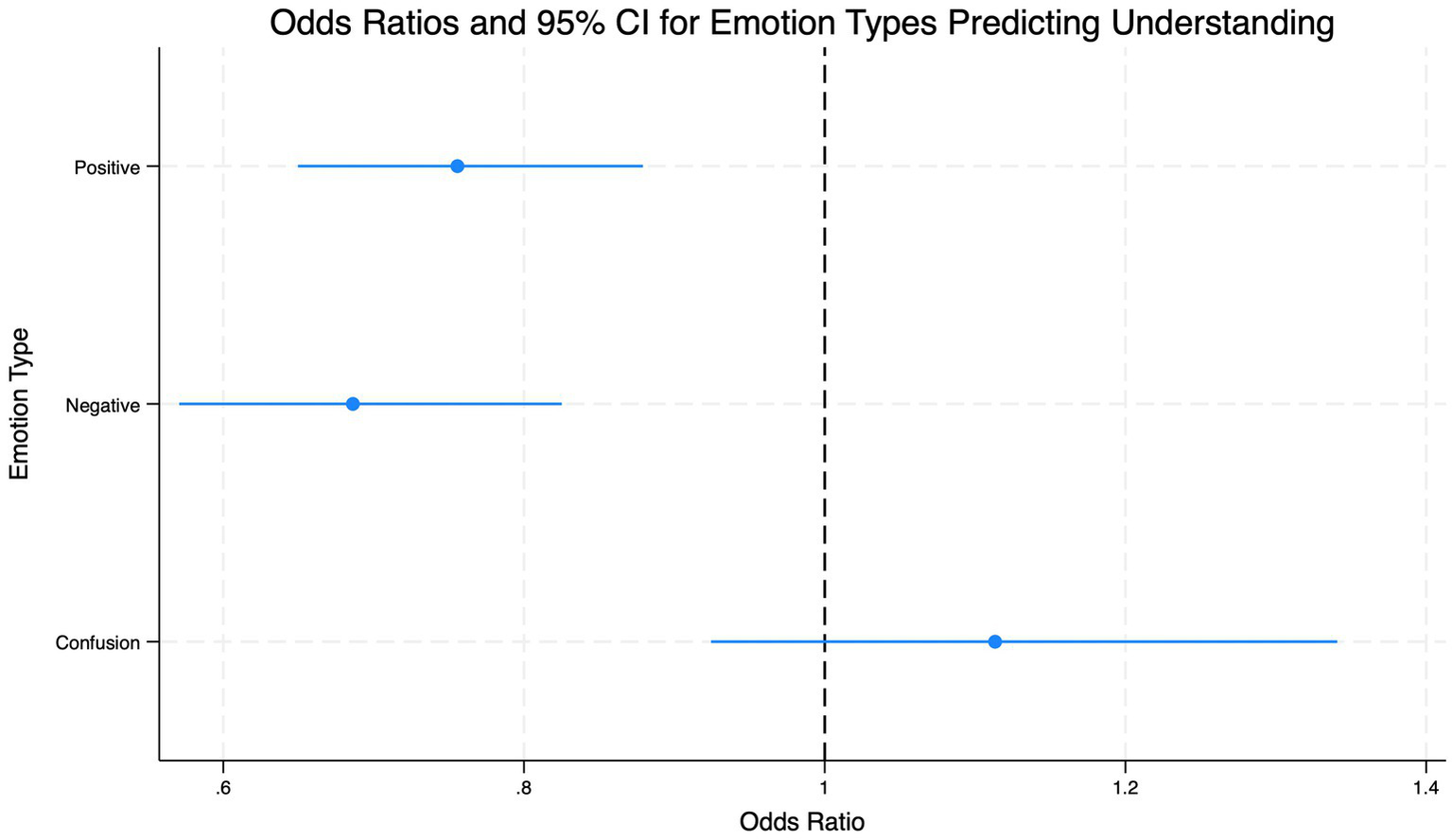 Plot showing odds ratios and 95% confidence intervals for emotion types predicting understanding. Positive and negative emotions have odds ratios less than one, while confusion has an odds ratio of one.