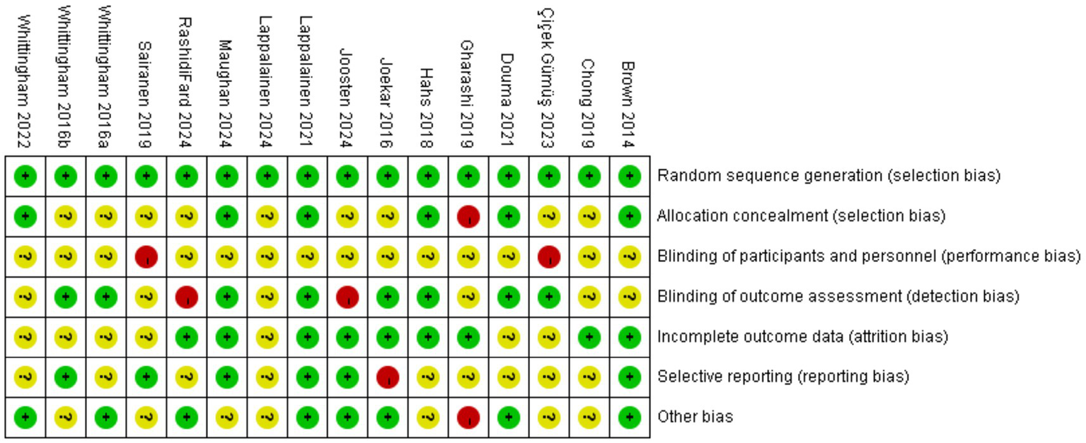 All included studies adequately described the generation of random allocation sequences and were assessed to have a low risk of selection bias associated with random sequence generation. Six trials explicitly reported details regarding allocation concealment and were rated as having a low risk (Hahs et al., 2018; Lappalainen et al., 2021; Maughan et al., 2024; Douma et al., 2021; Brown et al., 2014; Whittingham et al., 2022). At the same time, the remaining studies lacked sufficient detail and clarity, resulting in unclear or high-risk classifications. Regarding performance bias, the nature and number of personnel involved in the studies made it challenging for blind coaches or researchers. Nevertheless, in studies assessing the impact of ACT on depression among parents of children and adolescents with special needs, the blinding of outcome assessments was critical. Attrition and reporting biases were significantly influenced by five studies (Whittingham et al., 2016; Douma et al., 2021; Lappalainen et al., 2024; Whittingham et al., 2022; Çiçek Gümüş and Öncel, 2023). Figures 2, 3 illustrate a summary and evidence map of the risk of bias, respectively. Detailed information is provided in the Supplementary Table 1.