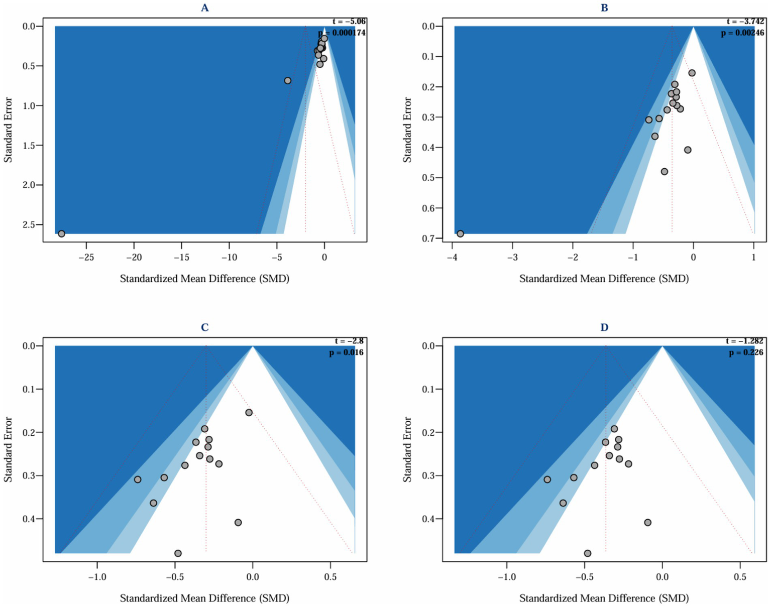 This study systematically evaluated the intervention effects of ACT on depression in parents of children with special needs by including 15 studies (Brown et al., 2014; Chong et al., 2019; Çiçek Gümüş and Öncel, 2023; Douma et al., 2021; Gharashi et al., 2019; Hahs et al., 2018; Joekar et al., 2016; Joosten et al., 2024; Lappalainen et al., 2021, 2024; Maughan et al., 2024; RashidiFard et al., 2024; Sairanen et al., 2019; Whittingham et al., 2016, 2022), which assessed depressive outcomes in a total of 837 parents. The heterogeneity among the studies was high (I2 = 89.5%, p < 0.0001), and a random effects model was employed for the analysis. The initial results indicated that ACT did not have a significant effect on depression in parents of children and adolescents with special needs (SMD = −2.01, 95% CI −4.86 ~ 0.83, p = 0.166). Given the high heterogeneity (I2 > 50%, I2 = 89.5%, p < 0.0001), Egger’s regression was conducted to evaluate potential publication bias. Egger’s regression, utilized to detect publication bias and assess the influence of minor study effects, initially indicated significant bias (t = −5.06, p = 0.000) (Figure 4A), suggesting that minor sample effects or data anomalies may have influenced the results (Gillespie et al., 2012). A sensitivity analysis was conducted to identify the sources of publication bias. This analysis aimed to assess the robustness and reliability of the results by altering key parameters or excluding specific studies. Initially, it was found that the study by Çiçek Gümüş and Öncel (2023) significantly influenced publication bias (Figure 5, top left). Even after excluding this study, Egger’s test indicated significant bias (t = −3.74, p = 0.002) (Figure 4B). Further sensitivity analysis revealed that the study by RashidiFard et al. (2024) also substantially contributed to the bias (Figure 5, top right); after excluding this study, Egger’s test remained significant (t = −2.8, p = 0.016) (Figure 4C). Moreover, the leave-one-out sensitivity analysis using R software dramatically reduced heterogeneity (I2 = 0), preventing further analysis and suggesting outliers. Subsequently, sensitivity analysis using Stata software indicated that the study by Chong et al. (2019) also significantly contributed to publication bias. After excluding the study by Chong et al. (Figure 5, bottom left and bottom right), Egger’s test became non-significant (t = −1.282, p = 0.226) (Figure 4D).