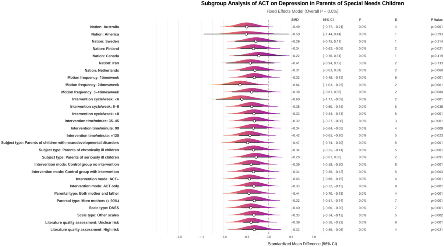 Subgroup analyses were conducted to investigate further the factors influencing the effects of ACT on depression in parents of children with special needs. The analyses considered various factors, including the type of condition affecting children and adolescents, the classification of parents, the modality of intervention, geographic region, duration of intervention, frequency, and cycle. However, no subgroup analysis was performed for parental age, as most parents were between 30 and 40.