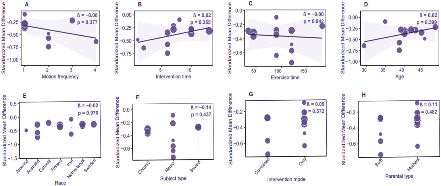 Although meta-regression did not identify any statistically significant moderators (p > 0.05), this may be attributed to the limited sample size in the subgroups (k = 12) and the dilution of single-factor effects by multidimensional interactions. Clinical decisions should primarily rely on subgroup analysis results, emphasizing the importance of the social welfare support system, the dose-sensitive window of the intervention, and the necessity for disease-specific tailoring.