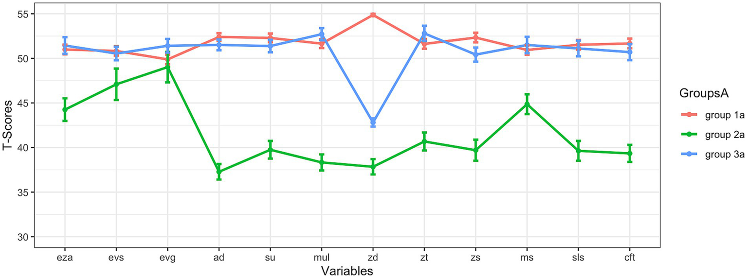 In this approach, all subtest-level results (except for the HRT 1–4) described in the methods section were used for subtyping, and incomplete data sets were excluded from the analysis (= 478). The analyses revealed three subgroups: Their cognitive profiles are shown in Figure 1. This three-subgroup-solution with an absolute BIC of 41008.16 was the best solution to subdivide the children of the analyzed sample into subgroups based on data. The best fitting model (EEV) that was therefore used for clustering encompasses clusters with the following characteristics: ellipsoidal distributions with equal volume and equal shape (Scrucca et al., 2016; Fraley et al., 2024). This solution will be analyzed in more detail, now.