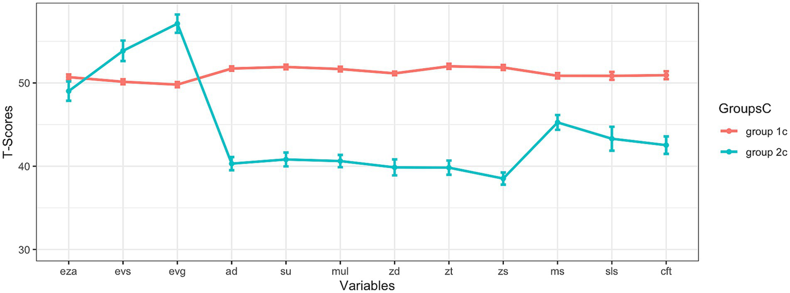 Furthermore, it was necessary to investigate whether the subgroups show cognitive profiles that differ equally in all cognitive domains or whether the identified subgroups exhibit greater differences in particular cognitive domains than in other: If two subgroups run parallel to each other, this would mean that the more severely impaired subgroup of these two groups is equally inferior to the other subgroup in all subareas. If the cognitive profiles do not run parallel to each other, the more impaired subgroup shows more difficulties in specific cognitive subareas than in other cognitive subdomains. Parallelism was analyzed using profile analysis by using the R package profileR (Bulut and Desjardins, 2020; Bulut and Desjardins, 2022).