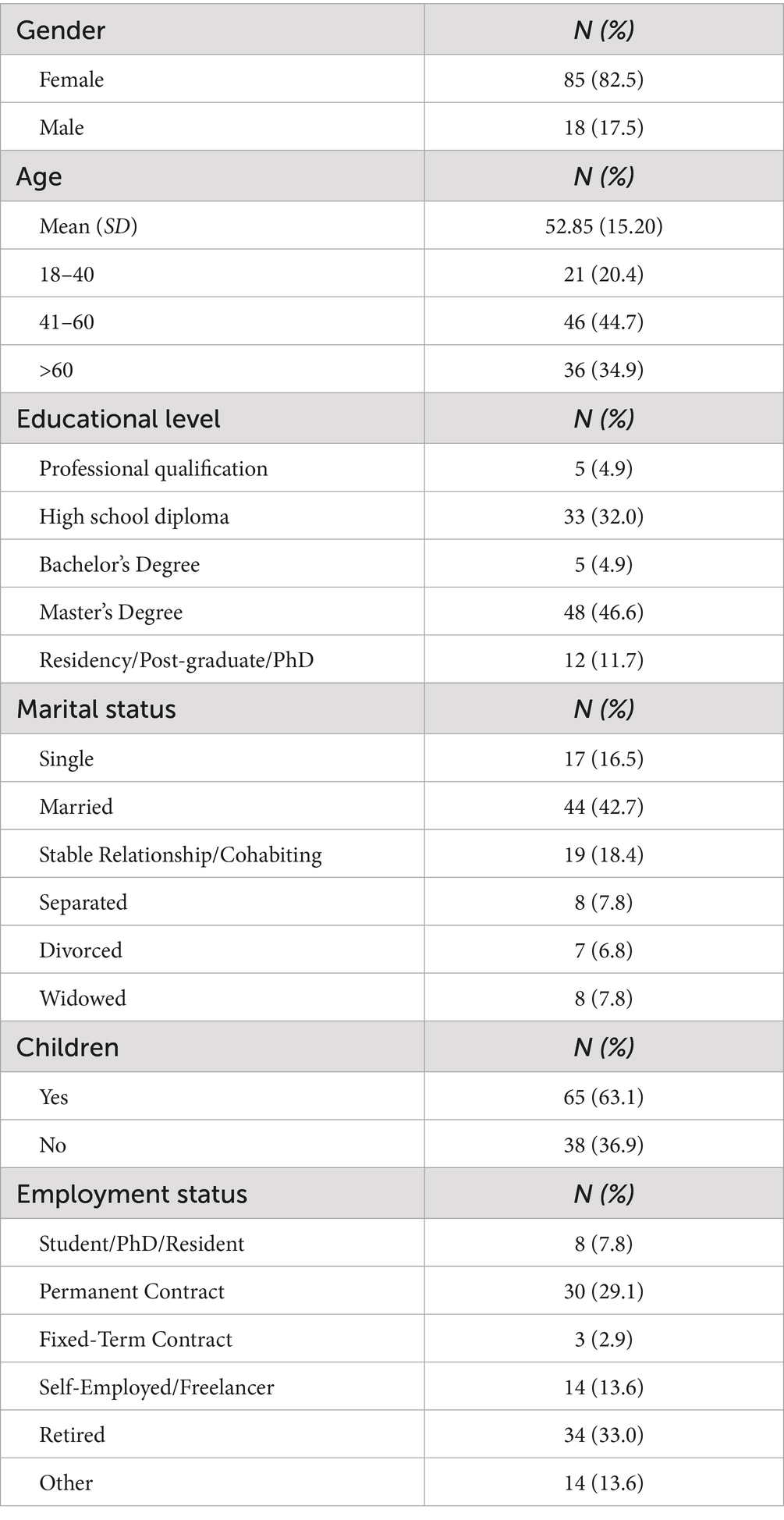 Of the 128 participants who expressed interest in the project, 103 were included in the analyses as they attended all three museum visits and completed the questionnaires at T1 and T2. The recruited 103 participants comprised 82.5% females, with an average age of 53. More than half had a master’s degree (47% had it as the highest title, and 12% had a PhD, master or residency). Among the sample, 43% were married, 63% had children, and were in various employment situations. Overall, it was a heterogeneous sample, representing diverse sociodemographic characteristics (Table 1). As reported in Table 2, at baseline (T1), the sample, on average, reported significant psychological distress in 67% of cases before the start of the museum itinerary, with mild anxiety in almost half of the cases and depressive symptoms of varying severity, coupled with medium to low levels of psychological well-being for almost two thirds of the sample.