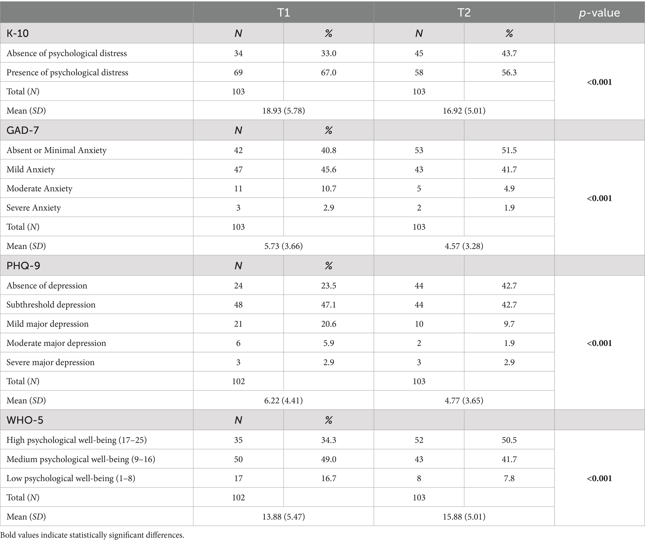 Descriptive statistics were used for demographic and clinical variables at both time points. Continuous variables were expressed as means and standard deviations, while categorical variables were expressed as absolute numbers and percentages. The following sociodemographic variables of interest were collected: age, gender, educational level, marital status, employment status and whether the person had children. Clinical scales were both considered as continuous and grouped into clinically meaningful categories according to established cut-off scores. For the K-10, psychological distress was classified as absence (0–15) vs. presence (16–50). Anxiety (GAD-7) was classified as absent or minimal (0–4), mild (5–9), moderate (10–14), or severe (15–21). Depression (PHQ-9) was classified as absent (0–4), subthreshold (5–9), mild (10–14), moderate (15–19), or severe (20–27). Psychological well-being (WHO-5) was categorized as high (17–25), medium (9–16), or low (0–8).