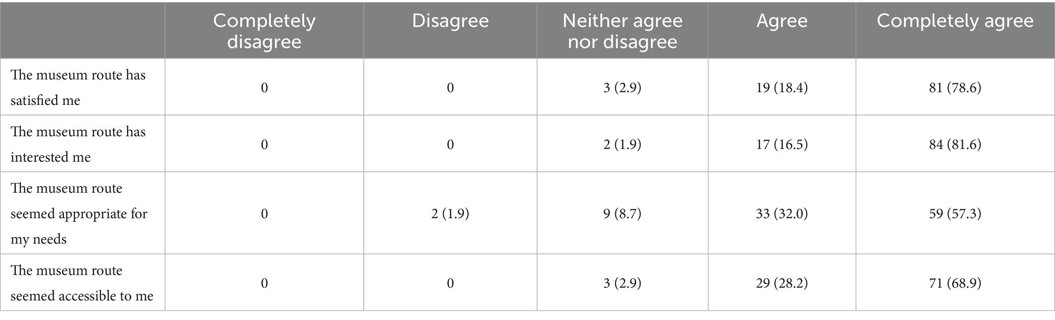 In relation to the implementability outcomes, the itinerary was highly appreciated by the participants. Ninety-seven per cent of participants either agreed or completely agreed that the museum itinerary satisfied them, 98% felt it was interesting, and 89% appropriate for their needs. Finally, 97% agreed or completely agreed that the museum itinerary was accessible and easy to use (Table 3).