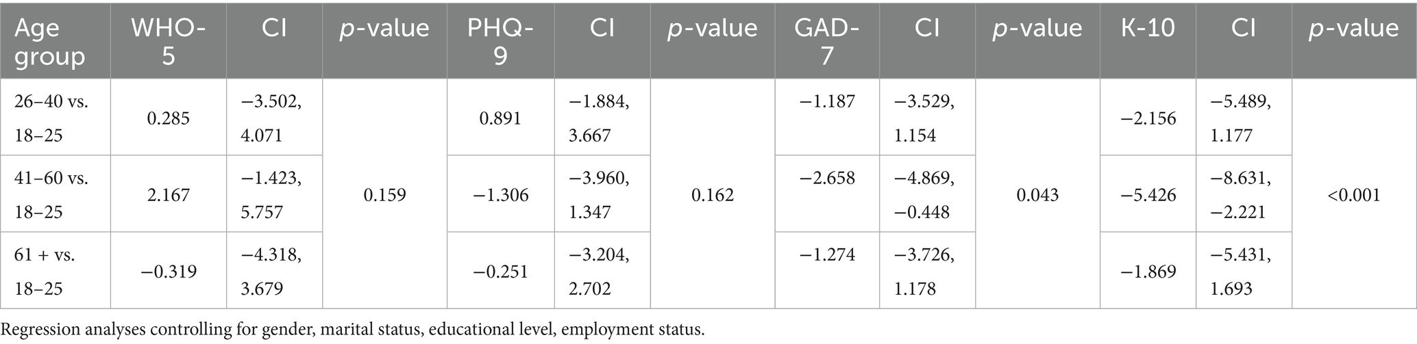 Regression analyses were performed, having as outcomes the total scores of PHQ-9, GAD-7, K-10 and WHO-5, and, as predictors, sociodemographic variables (age, gender, having a bachelor degree, being in a stable relationship, being employed, being a parent), controlling for the baseline value of the outcome in order to interpret results in terms of conditional association with change. The statistical significance of the three parameters related to age was always assessed jointly, to make results independent from the choice of the reference category.