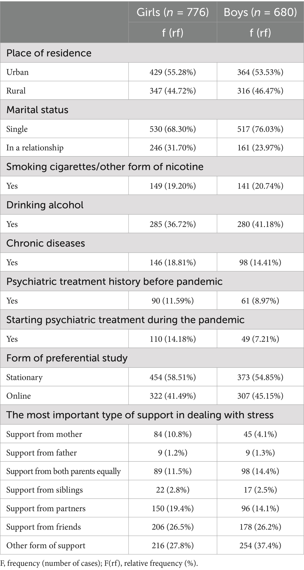 A total of 1,456 students aged 14 to 19 participated in the study (M = 16.77, SD = 1.33), including 776 girls (M = 16.78, SD = 1.34) and 680 boys (M = 16.77, SD = 1.36). All respondents provided informed consent, and for those under the age of 18, parental consent was also obtained in accordance with ethical guidelines. Demographic data regarding the study group, divided into girls and boys, are presented in Table 1.