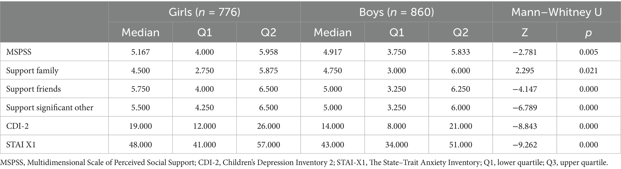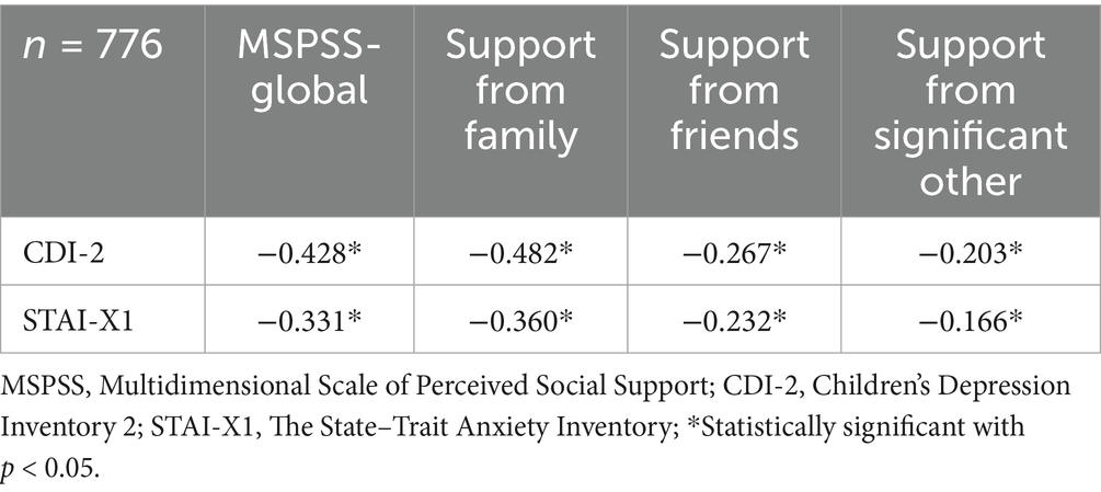 The Spearman rank correlations were used to examine the associations between the MSPSS total score and the CDI-2 and between the MSPSS total score and the STAI-X1, separately for girls and boys. Statistically significant negative correlations were observed between depressive symptoms (CDI-2) and anxiety symptoms (STAI-X1) and perceived social support (MSPSS), including its total score and all subscales, in both groups (see Tables 3, 4).