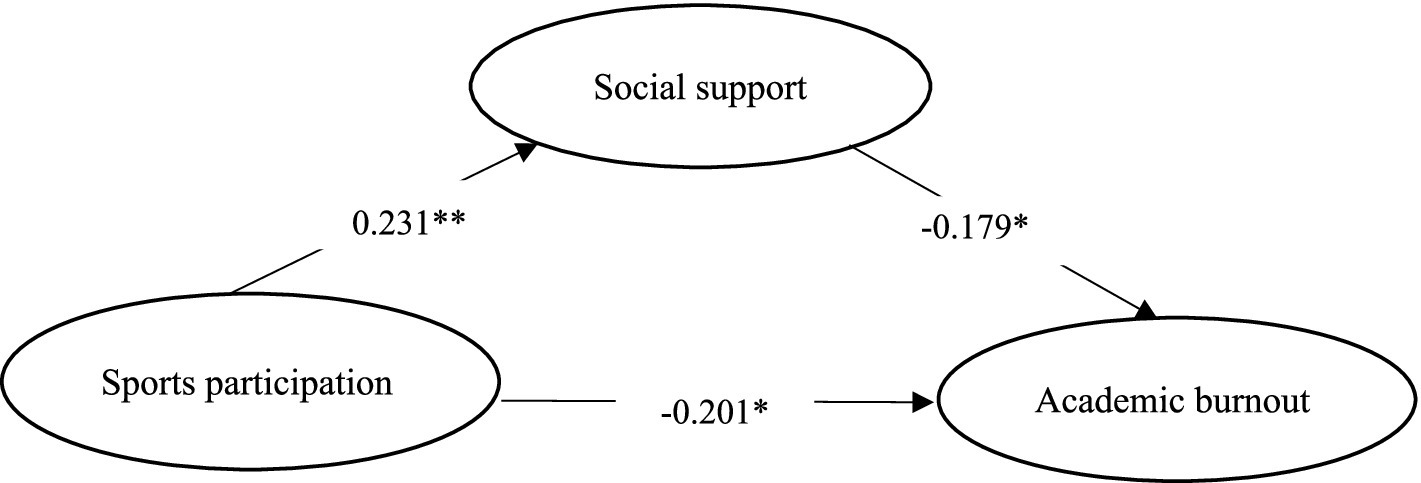 The results of the correlation analysis showed (see Table 2) that sports participation and academic burnout were significantly positively correlated with social support, and social support was significantly negatively correlated with academic burnout, which verified the initial hypothesis of this study and provided a better foundation for the subsequent mediation effect test of this study.