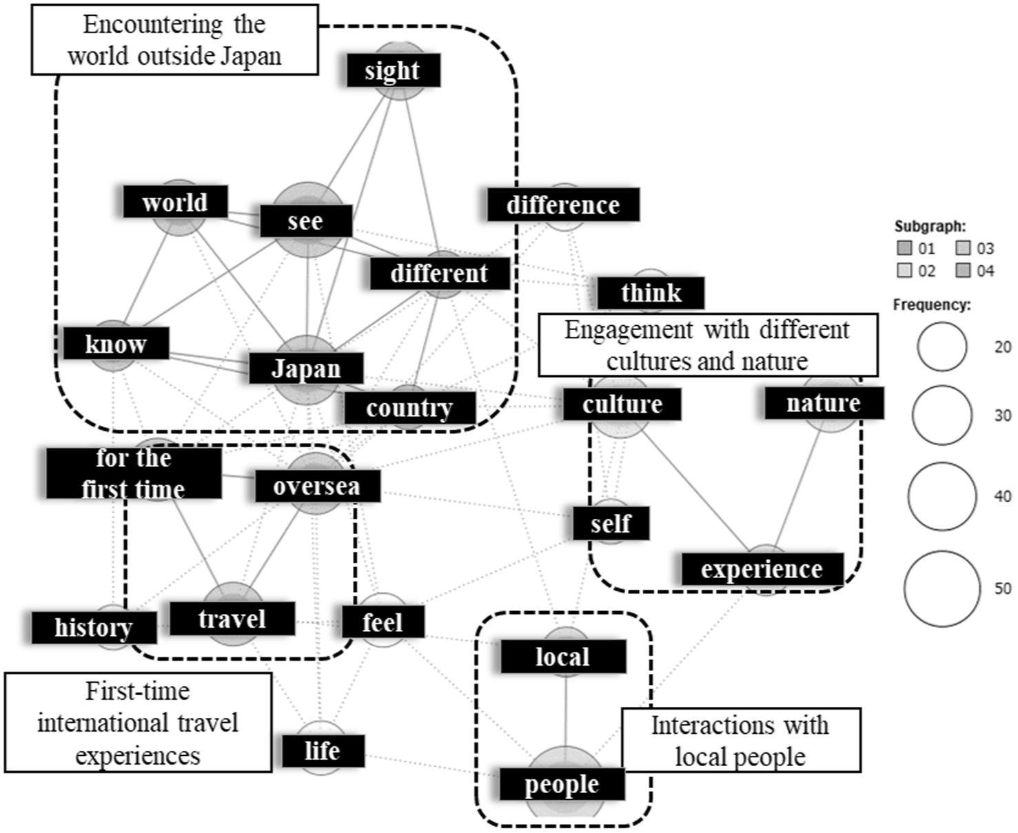 Subsequently, responses to three kinds of open-ended questions were analyzed using text mining, including triggers of TTE and changes brought about by TTE reported by TTE-experienced participants, as well as impressive experiences from the most memorable travels as reported by TTE-inexperienced participants. The analytical procedures were as described by Nishimura and Shimizu (Nishimura and Shimizu, 2021). Before the preliminary analysis, typographical errors were corrected and synonyms were standardized. Morphological analysis was then performed and a co-occurrence network was generated to facilitate the interpretation and categorization of the response content.