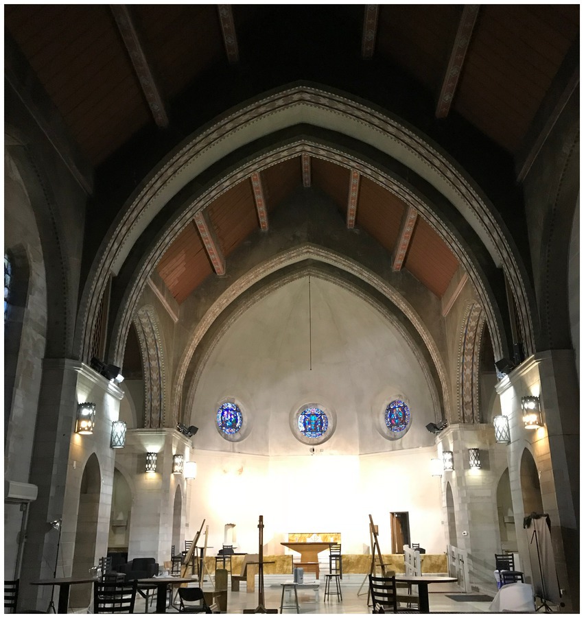 Interior of a church featuring a vaulted ceiling with exposed wooden beams. Three circular stained glass windows adorn the far wall. The altar area is brightly lit, with tables, chairs, and some art materials scattered around, giving a sense of artistic activity.