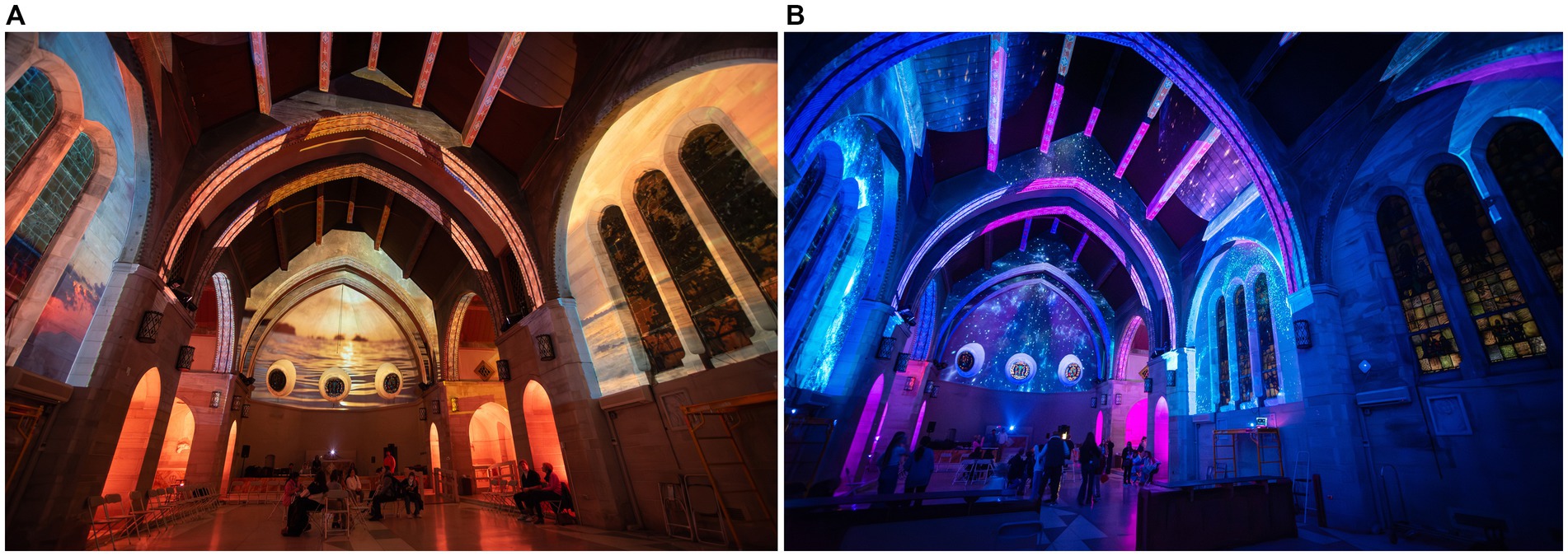 Figure 2. Ravenhill Chapel as an immersive experience [(A) sunset imagery, (B) galaxy imagery]. Image credit ©Thomas Jefferson University Photography.