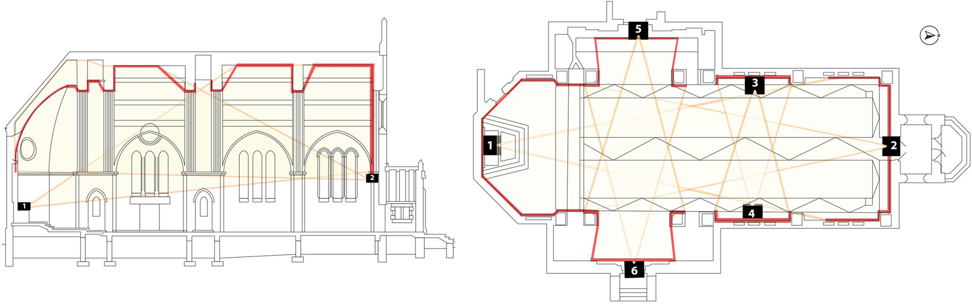 Figure 3. Schematic and floorplan of Ravenhill Chapel showing projector placement. Image credit Lyn Godley and Olivia Dec.