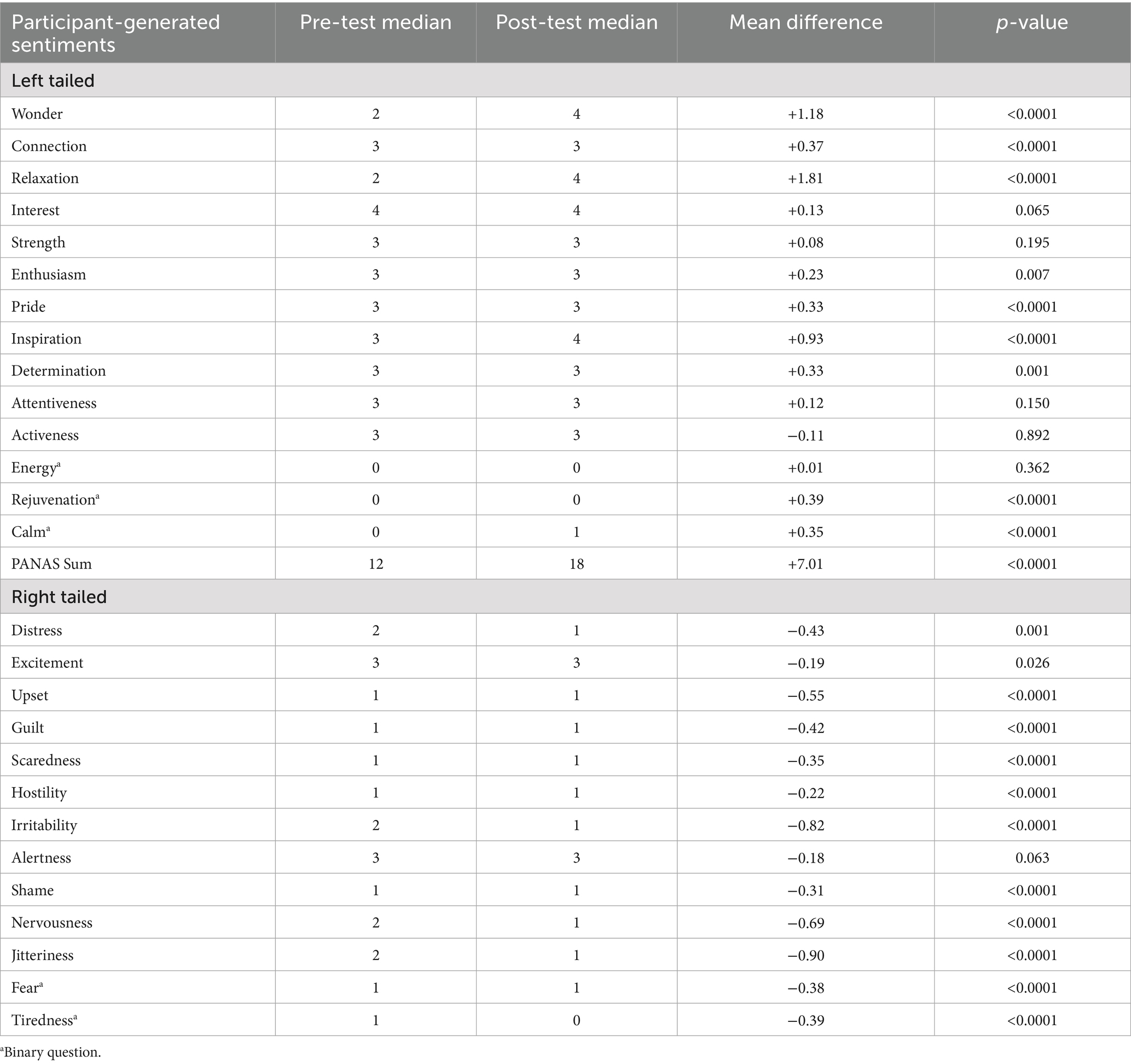 Responses to the PANAS-SF were summarized and pre-visit and post-visit comparisons were made. Owing to the ordinal nature of the PANAS-SF survey and the sample size, we opted to perform a series of unidirectional Wilcoxon signed-rank tests to gauge the impact of the installation on attendees’ mood (Table 1).