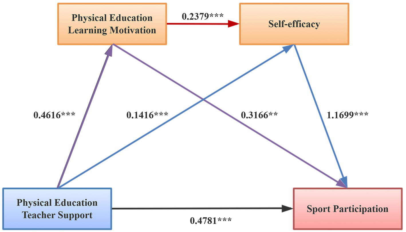 Physical education teacher support, PE learning motivation, self-efficacy, and sport participation were all significantly positively correlated. The impact of PE teacher support on sport participation was mediated through three pathways: solely through PE learning motivation (mediating effect value: 0.146), solely through self-efficacy (mediating effect value: 0.166), and through the combined effect of PE learning motivation and self-efficacy (mediating effect value: 0.129).