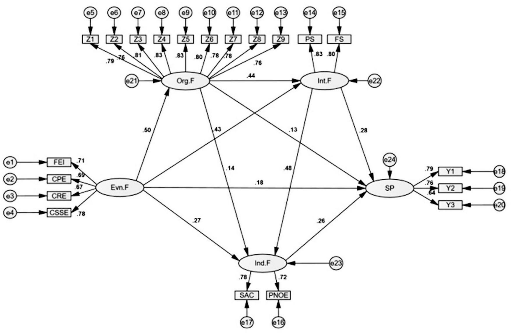 | H9 | Env. F influence Int. F, which then influence Ind. F, ultimately affecting SP |