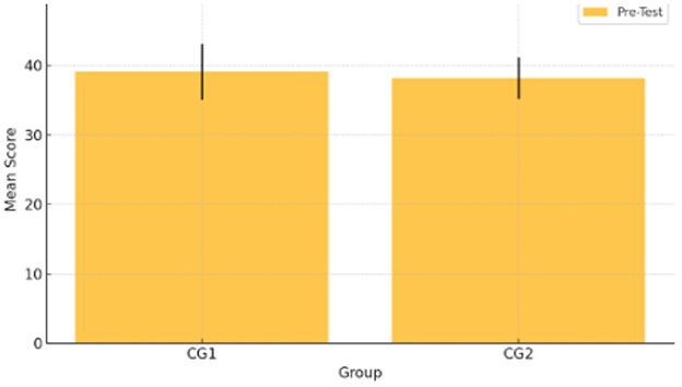 Bar chart showing mean scores for two groups, CG1 and CG2, on a pre-test. Both groups have scores around 40, represented by orange bars with error bars indicating variability.