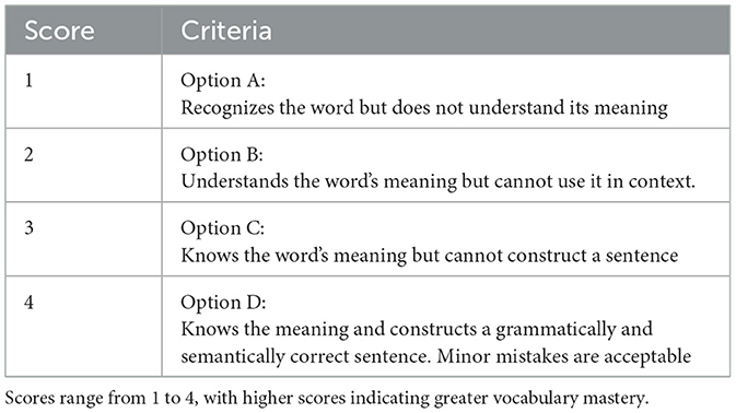In this study, two research instruments were used to collect data from the learners: the Demographic Information Questionnaire and the Self-Report Vocabulary Knowledge Scale (SRVMS). The Demographic Information Questionnaire was administered before the intervention to gather background information about the participants, including their age and gender. It also provided an overview of the study and included instructions on how to complete the form. To ensure anonymity, participants were not asked to provide their real names; instead, they were instructed to use a pseudonym and an assigned number. The SRVMS (check Appendix A) was administered both before and after the teaching intervention. This scale was designed to measure learners' vocabulary knowledge, focusing on their ability to understand and use the target words taught during the program. The same 35 vocabulary items used in instruction were also used as test items in the SRVMS. To ensure validity and reliability, the SRVMS was piloted with a similar group of 62 students prior to the main study, using the same target words. The pilot results indicated that the scale was reliable for measuring learners' vocabulary knowledge in this context. The pre-treatment administration served as a baseline for learners' initial vocabulary knowledge, while the post-treatment version allowed the researchers to assess vocabulary gains and evaluate the effectiveness of the instructional methods. The scoring system, adapted from Esit's (2007) thesis and subsequently modified for this study, was reviewed by a statistician to ensure its validity. The scoring system is described in Table 2.