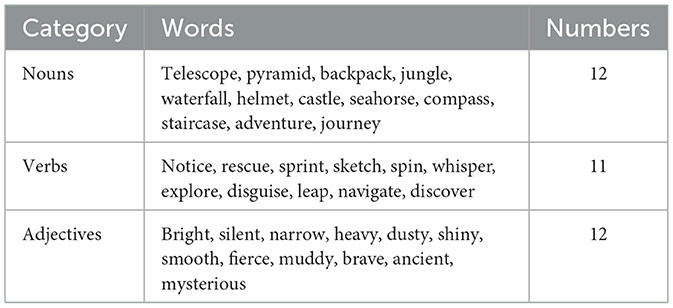 For this study, researchers selected 35 target vocabulary items from the Active Learn online readers' platform. These words were chosen from 12 books at the Gray and Blue levels, which are designed for learners at the participants' proficiency level. Importantly, these particular books had not been previously used in classroom instruction, and the students had no prior exposure to the selected words. the Active Learn platform was familiar to students as part of their regular learning environment, care was taken to ensure that the specific vocabulary items used in this study were new to them. Additionally, to isolate the effect of the instructional methods, the books themselves and their accompanying digital activities were not used during the intervention. The selected vocabulary was categorized according to grammatical type and semantic field, as shown in Table 3.