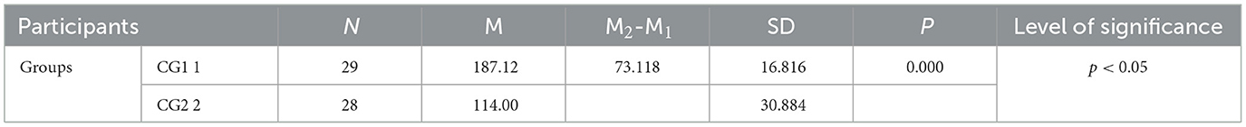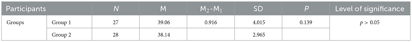 To ensure both groups started from a similar point, a pre-test was administered before the intervention. The results showed that Group 1 had a mean score of 39.06 (SD = 4.015), while Group 2 had a mean of 38.14 (SD = 2.965). Although there was a slight difference between the groups, it was not statistically significant (p > 0.05), indicating that the students' vocabulary knowledge was roughly equivalent at the beginning of the study. This is presented in Table 4.