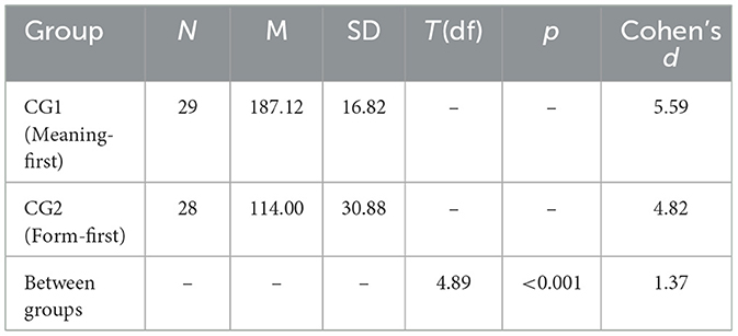 Table 6 presents the post-test results of both groups, comparing their vocabulary gains following the instructional intervention. While both the meaning-first (CG1) and form-first (CG2) groups showed improvement, students in the meaning-first group achieved substantially higher mean scores (M = 187.12, SD = 16.82) compared to the form-first group (M = 114.00, SD = 30.88). The independent-samples t-test confirmed that this difference was statistically significant, t(55) = 4.89, p < 0.001, with a large effect size (Cohen's d = 1.37). This is also supported on Figure 2.