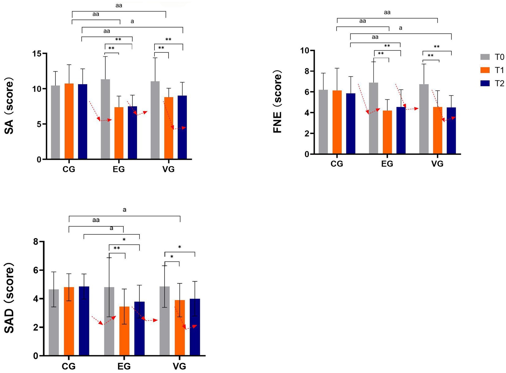 Figure 1. Effects of different interventions on SA, FNE, SAD. * p <0.05, ** p<0.01. a < 0.05, aa < 0.01, compared with CG.
