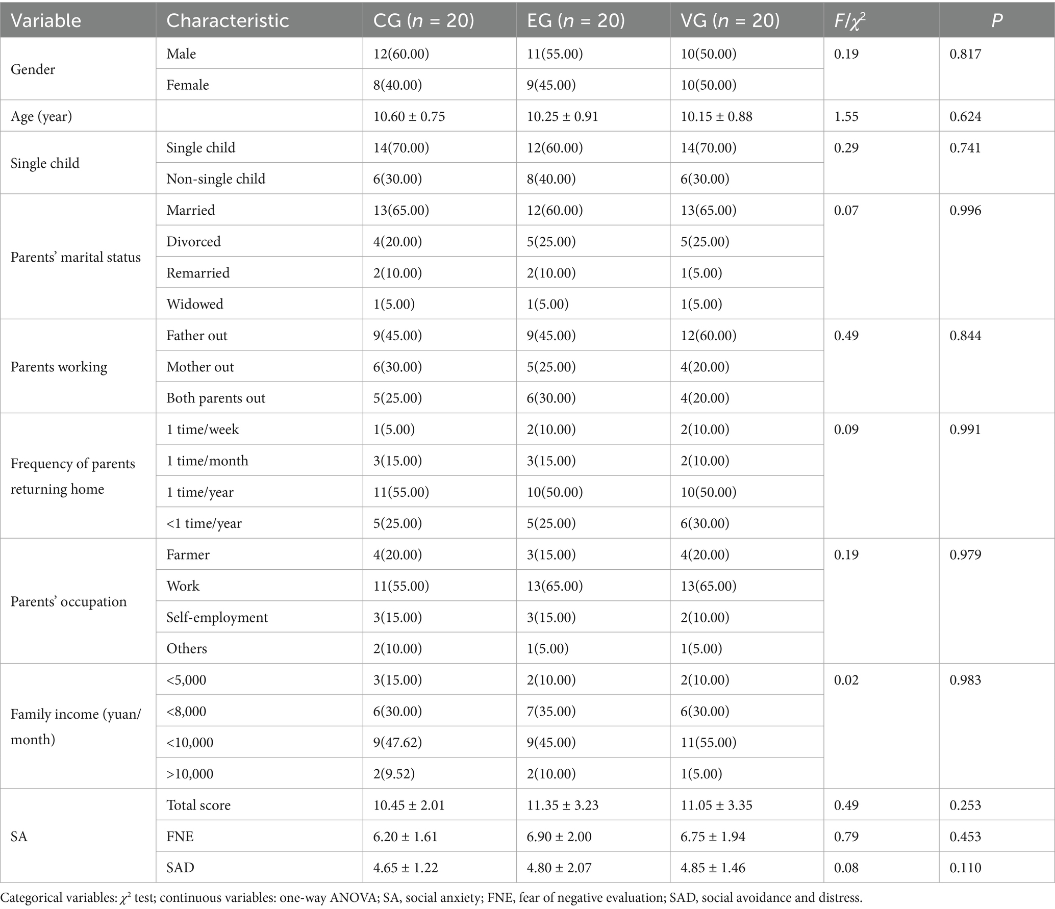 Table 1 indicated no significant differences among the three groups regarding general demographic information, including gender, age, grade, sibling status, parents’ marital and employment status, frequency of parents returning home, parental occupation, and family income (p > 0.05). All demographic variables in Table 1 were evaluated as potential covariates for social anxiety outcomes. None demonstrated significant group-wise differences (p > 0.05), confirming their homogeneity across experimental conditions.