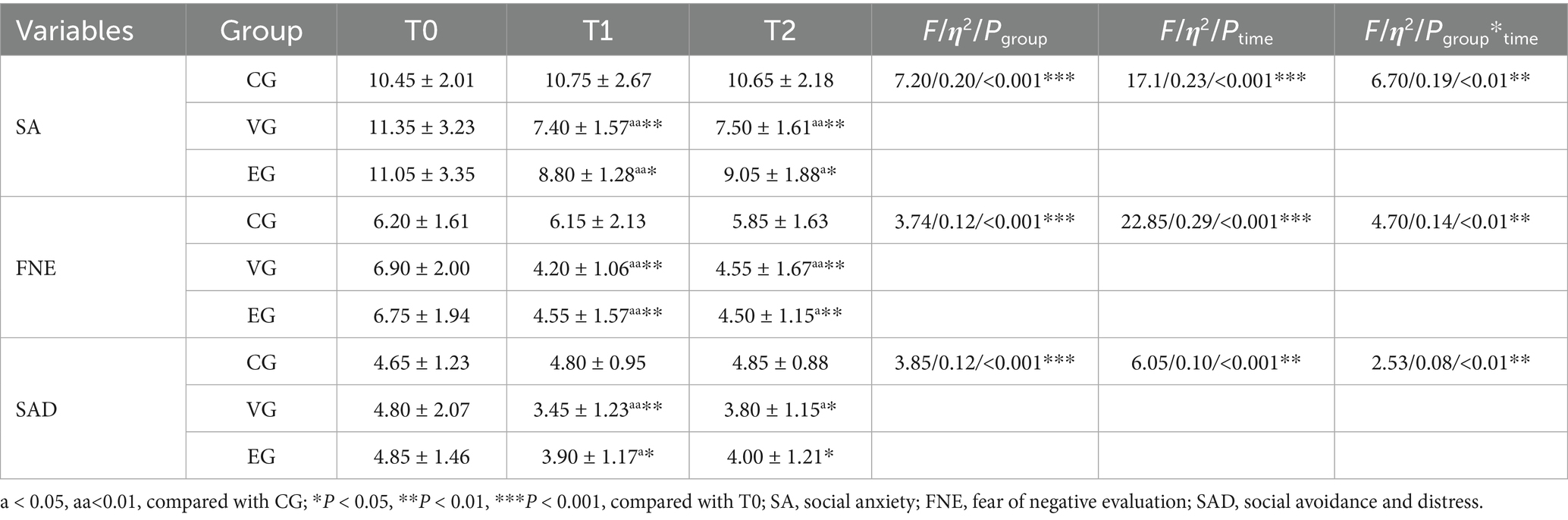 In the group factor analysis, significant effects were observed for the total score [F(2,57) = 7.20, p < 0.01, η2 = 0.20], FNE factor [F(2,57) = 3.74, p < 0.01, η2 = 0.12], and SAD factor [F(2,57) = 3.85, p < 0.01, η2 = 0.12]. Initially, at baseline (T0), no significant differences existed between intervention and control groups in total score, FNE, and SAD factors (p > 0.05). However, during the intervention, CG showed significantly higher total scores than the other two groups (p < 0.05). VG had notably higher scores than EG at both T1 and T2 (p < 0.05). Regarding FNE scores, CG scored significantly higher than the other two groups at both T1 and T2 (p < 0.05). Nonetheless, EG scored higher than VG at T1 (p > 0.05), with no significant difference between the two groups at T1 and T2. For SAD scores, CG scored significantly higher than the other two groups at T1 (p < 0.05). Importantly, no significant differences were found between VG and EG in total scores and scores across all dimensions (p > 0.05), although EG scored higher than VG at T1 and T2 (Table 2 and Figure 1).
