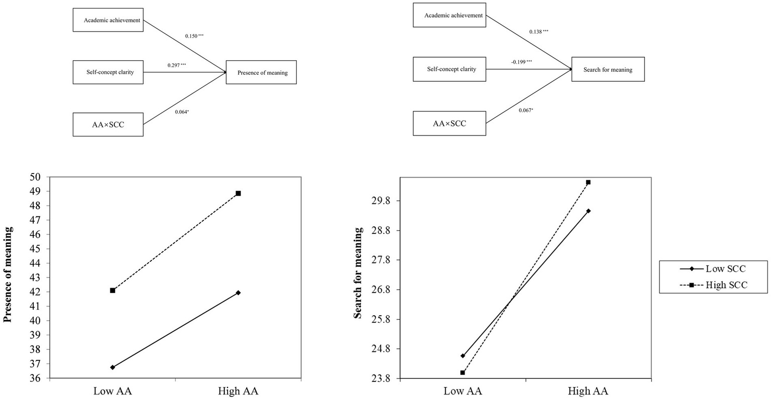 Moderation model for academic achievement and presence of meaning and search for meaning across self-concept clarity. AA is the abbreviation for academic achievement, and SCC is the abbreviation for self-concept clarity. Standardized coefficients are presented. ***p < 0.001, *p < 0.05.