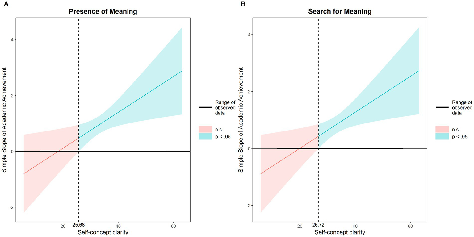 Johnson-Neyman plot of Self-Concept Clarity’s Moderating Effect. SCC, Self-Concept Clarity. For Presence of Meaning, (A) the effect of Academic Achievement is significant when SCC > 25.68. For Search for Meaning, (B) the effect is significant when SCC > 26.72. Observed SCC range: 12.00 to 57.00 for both analyses.