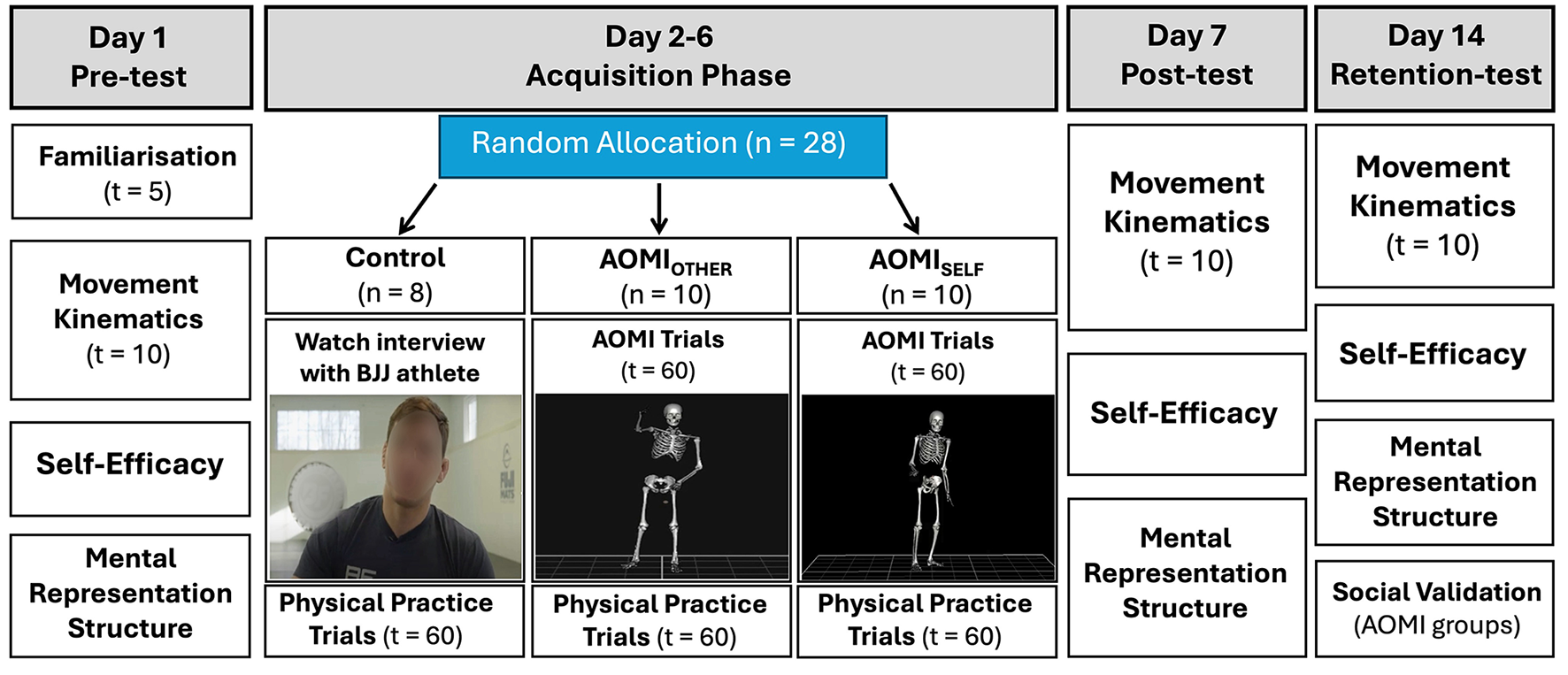 Participants returned to the biomechanics laboratory 1 day and 8 days after finishing the final training session of the acquisition phase to complete the post-test (Day 8) and retention-test (Day 15) data collections, respectively. A buffer day was included between the pre-test (Day 1) and the start of the acquisition phase (Day 3) to allow time for processing data and preparing the materials for the AOMISELF condition from the data collected in the pre-test session. The protocol for both data collection sessions mirrored that of the pre-test, recording movement kinematics, self-efficacy, and mental representation structures for the Ankle Pick takedown for a second and third instance across the study period. At the end of the experiment, participants allocated to the AOMISELF and AOMIOTHER training conditions completed a social validation questionnaire and interview. The social validation procedures aimed to gather perceived changes in motor skill performance, self-efficacy and mental representations for the training condition, and assess perceived ability to engage with the simulation processes and embody the movements displayed by the avatar during the AOMI training protocol (see Supplementary material for full details and reporting of social validation data).