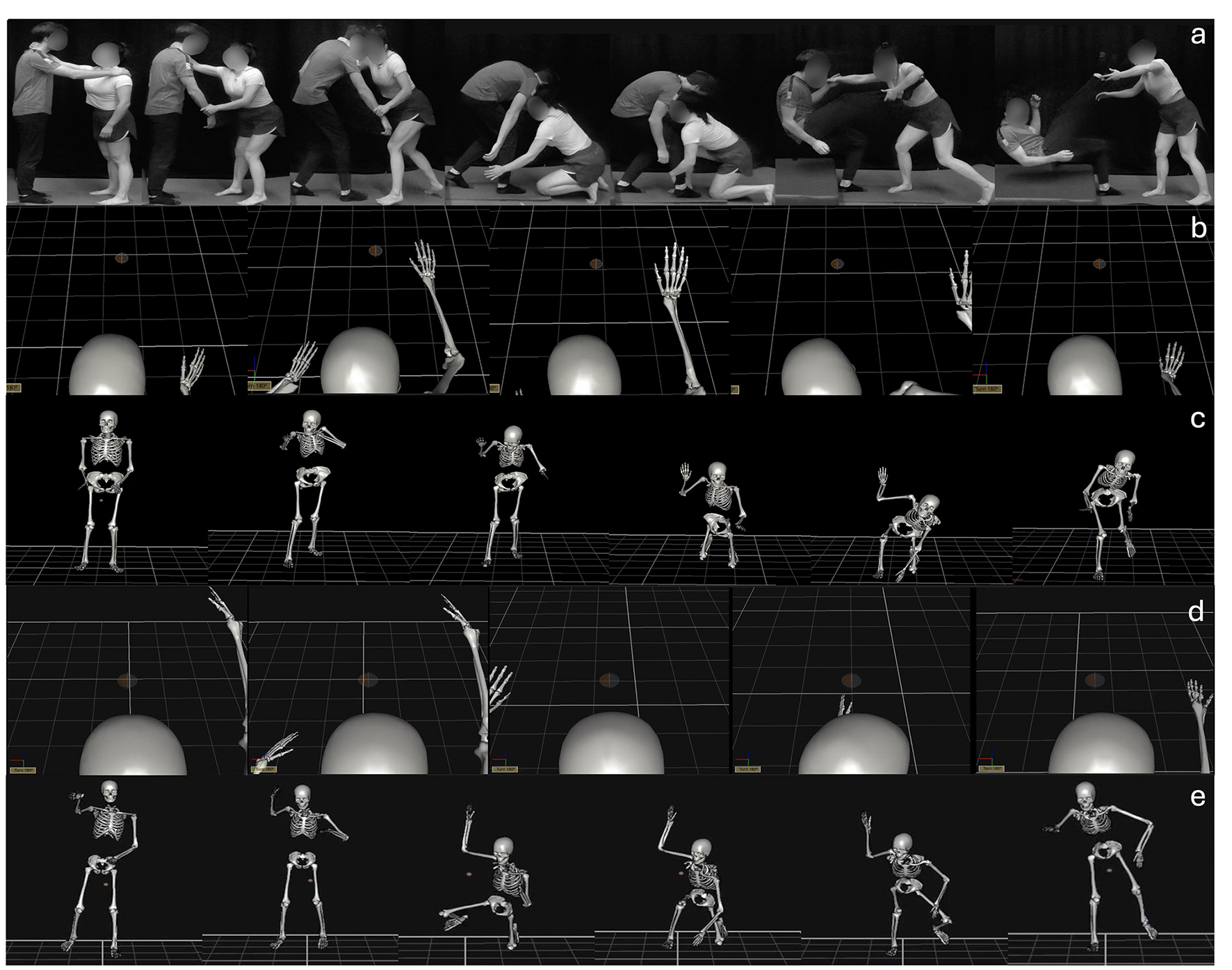 A visual depiction of (a) a skilled grappling athlete demonstrating the Ankle Pick takedown with an opponent, (b) exemplar egocentric perspective and (c) allocentric perceptive skeleton-like avatar video footage for one of the novice learners allocated to the AOMISELF training condition, (d) the egocentric perspective and (e) allocentric perspective skeleton-like avatar video footage for a skilled performer adopted in the AOMIOTHER training condition.