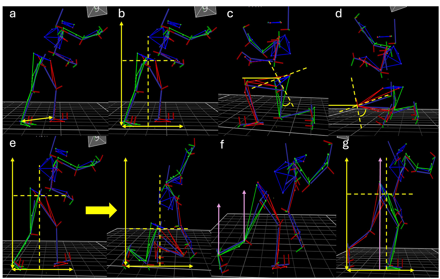 Kinematic models of the data extraction points for biomechanical kinematic markers underpinning successful movements as a measure of motor skill performance in this study. Panels display extraction points for the (a) base of support, (b) and horizontal and vertical center of mass during the stance phase, (c) peak left hip flexion angle, (d) peak left knee flexion angle, (e) and change in horizontal and vertical center of mass during lowering phase, (f) peak right knee peak right ankle extension velocities, and (g) peak vertical center of mass velocity during the propulsive phase. Peak angle time difference is calculated based on the time between (c, d), mean vertical velocity is extracted for the lowering phase depicted in the two frames for (e).