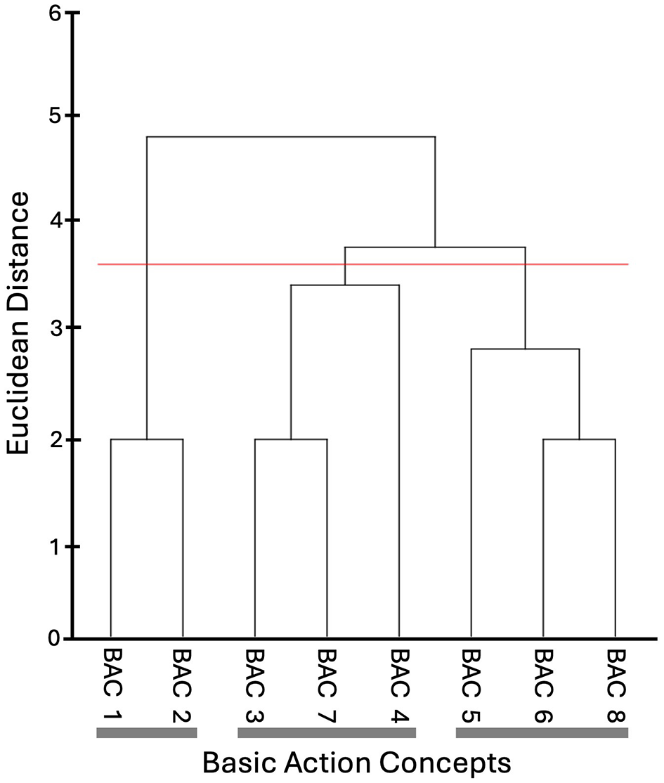 Mean group tree diagram of the Ankle Pick takedown for the reference group of two skilled grappling athletes. Each BAC is labeled on the x-axis (for the list of BACs, see Table 2). The numbers on the y-axis display Euclidean distances. The lower the Euclidean distance between BACs, the closer the BACs are. The horizontal red line marks the critical value dcrit for a given α-level (dcrit = 3.51; α = 0.05). Thick horizontal gray lines below the BAC labels on the x-axis depict clusters of BACs.