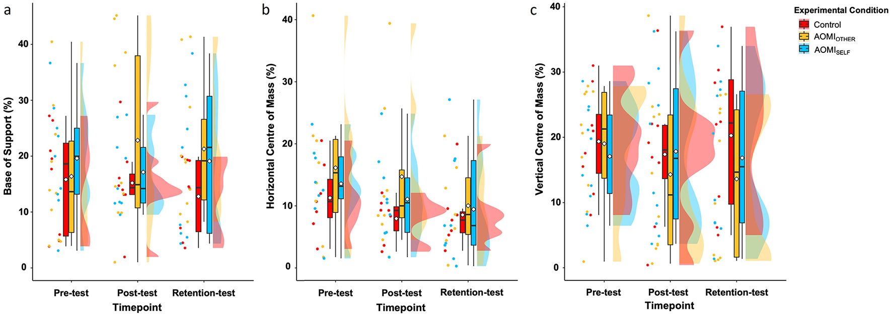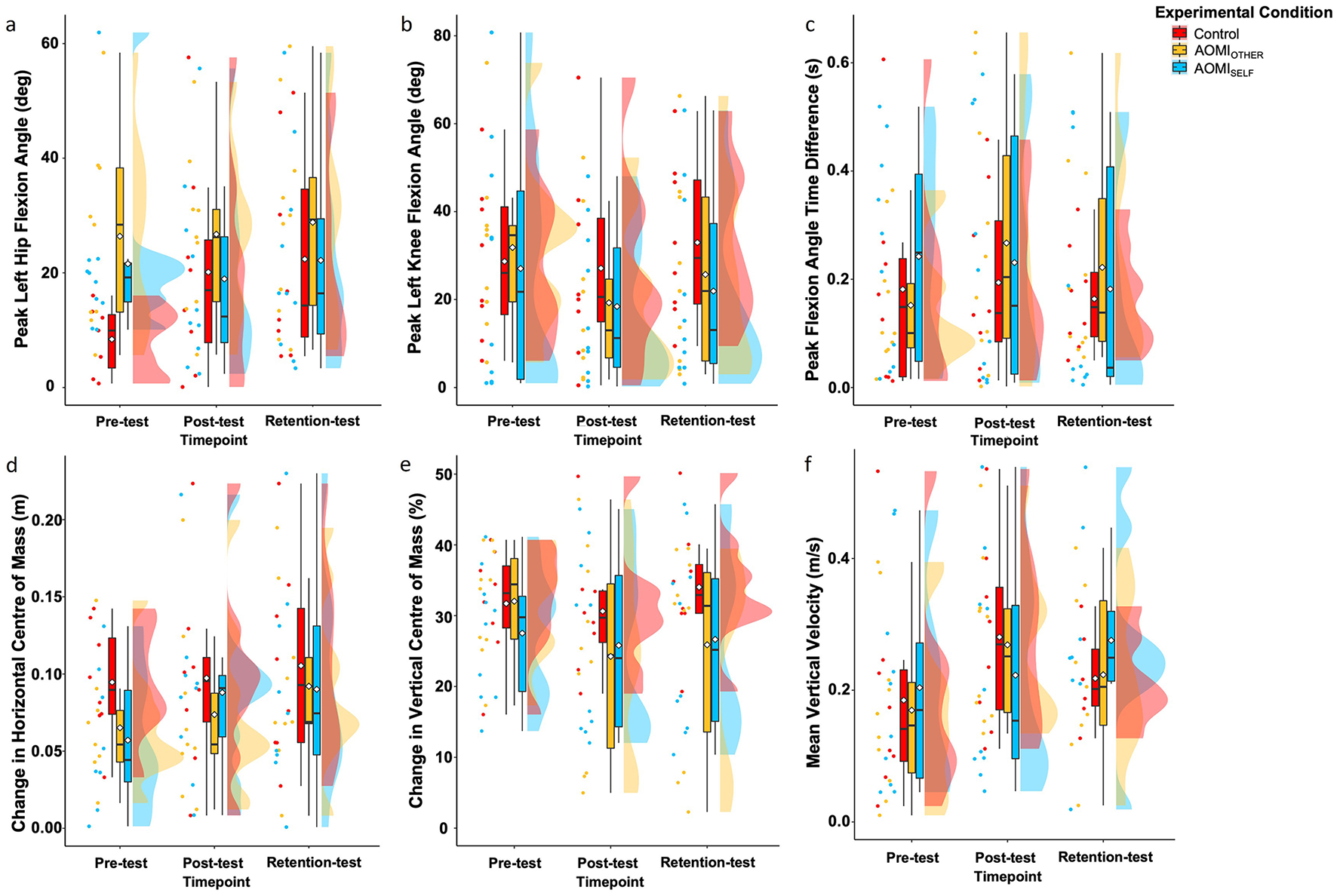 To account for potential washout effects in the motor skill performance data that may have resulted from the large trial-count used across the testing procedures, we loaded “trial count” as a factor into the MLMs as a continuous fixed effect. This was calculated using a sequential moving average (i.e., trial count n is represented by the average of trials 1-n) and the outliers removed from the main analysis were also excluded from this analysis. We only considered the data at post-test and retention-test as the pre-test data was taken prior to the intervention, meaning washout is not an issue at this point. There was no main effect of trial count for most kinematic variables at post-test (n = 9) and retention-test (n = 7). An interaction effect of trial count x training condition was present for two kinematic variables at post-test and at retention-test. Follow-up pairwise comparisons for Horizontal Center of Mass showed that error scores for the AOMIOTHER training condition were significantly lower at trial 1 compared to trials 3–10 at post-test. Follow-up pairwise comparisons for Peak Flexion Angle Time Difference showed no significant differences in error scores for the AOMIOTHER training condition across trial counts at post-test. Follow-up pairwise comparisons for Change in Horizontal Center of Mass showed that error scores for the AOMIOTHER training condition were significantly lower at trial 1 compared to trials 2 and 3 at retention-test. Follow-up pairwise comparisons for Peak Right Ankle Extension Velocity showed that error scores for the AOMISELF training condition were significantly higher at trial 1 compared to trials 3–10, and at trial 2 compared to trials 9 and 10 at retention-test. These analyses suggest there is no systematic presence of a washout effect due to the number of trials used for the testing procedures adopted in this study.
